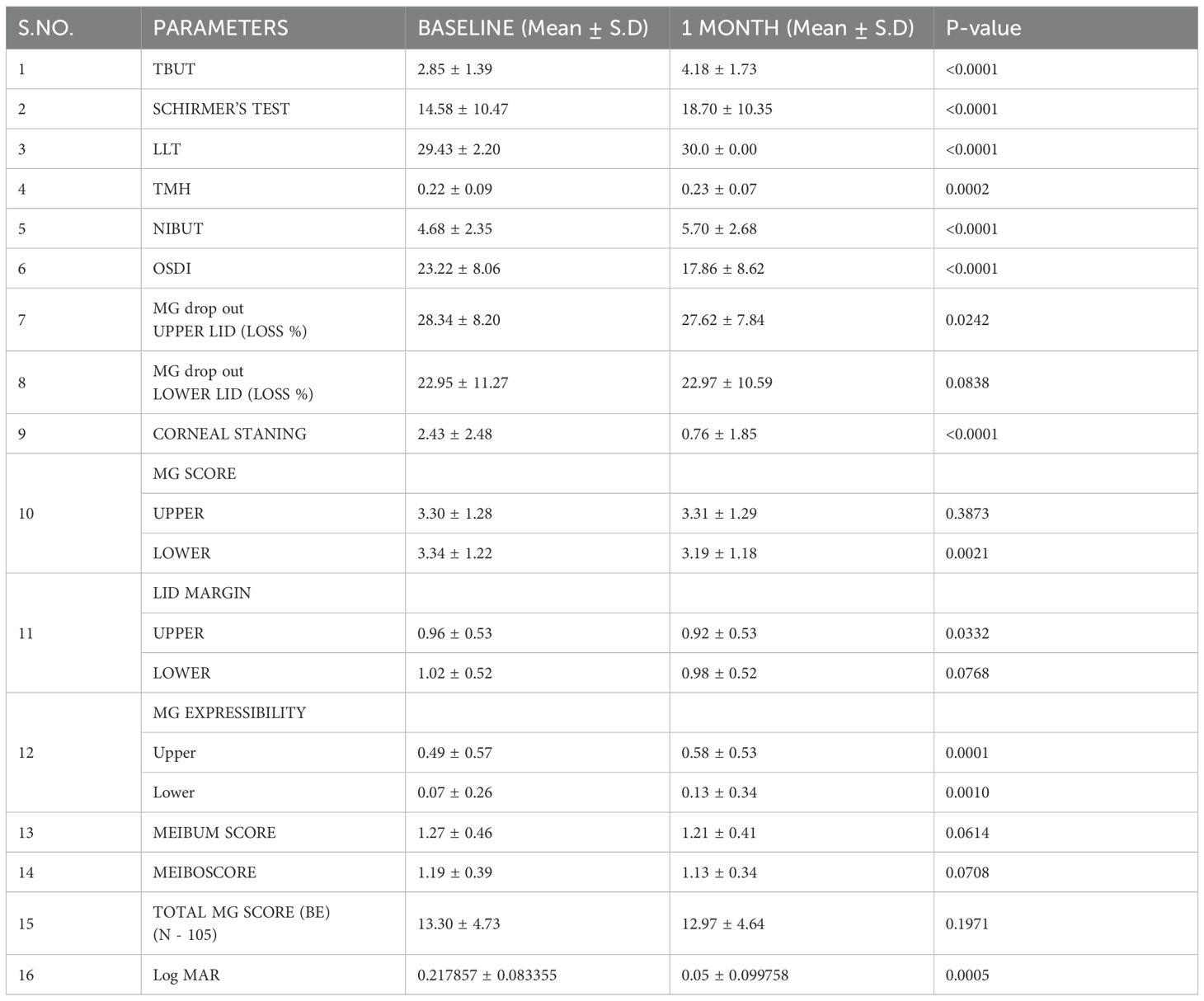 At the 1-month follow-up, tear breakup time (TBUT) improved from a mean of 2.85 ± 1.39 s to 4.18 ± 1.73 s (p<0.0001). The mean Schirmer score increased from 14.58 ± 10.47 to 18.70 ± 10.35 (p<0.0001). Lipid layer thickness (LLT) improved from 29.43 ± 2.20 to 30.0 ± 0.00 (p<0.0001). Tear meniscus height (TMH) increased from 0.22 ± 0.09 to 0.23 ± 0.07 (p=0.0002). Non-invasive breakup time (NIBUT) improved from 4.68 ± 2.35 s to 5.70 ± 2.68 s (p<0.0001). The corneal staining score decreased from 2.43 ± 2.48 to 0.76 ± 1.85 (p<0.0001).