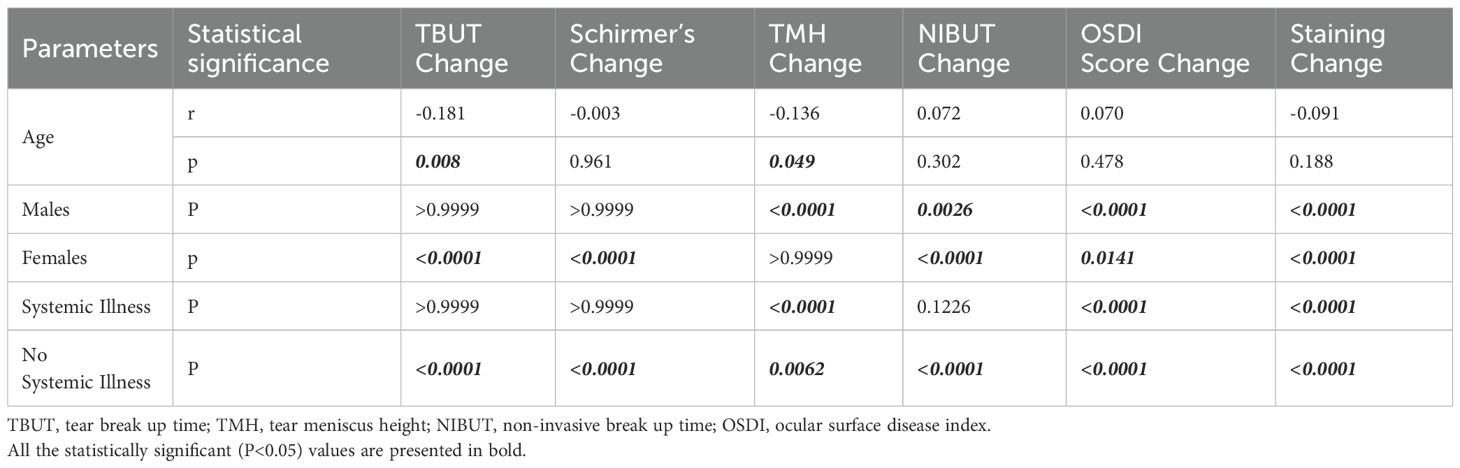 The only TBUT and TMH showed correlation with the age (p=0.008 and 0.04), while rest parameters (including NIBUT) had no co-relationship. The objective parameters of dry eye disease were comparable in males and females except change in TMH. The cases with no systemic illness had significantly higher improvement in tear film stability (TBUT, NIBUT and Schirmer score) as compared to cases with systemic illness. (Table 2).