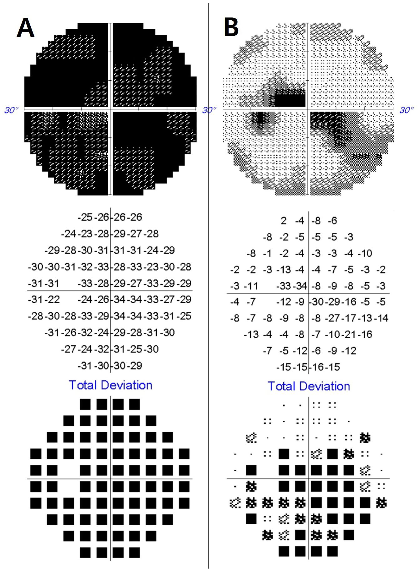 Figure 2. Initial Humphrey perimetry demonstrates a severe visual field defect in the left eye [mean deviation: –29.52 dB, (A)]. Following treatment, the visual field markedly improved, with a mean deviation of –10.13 dB (B).