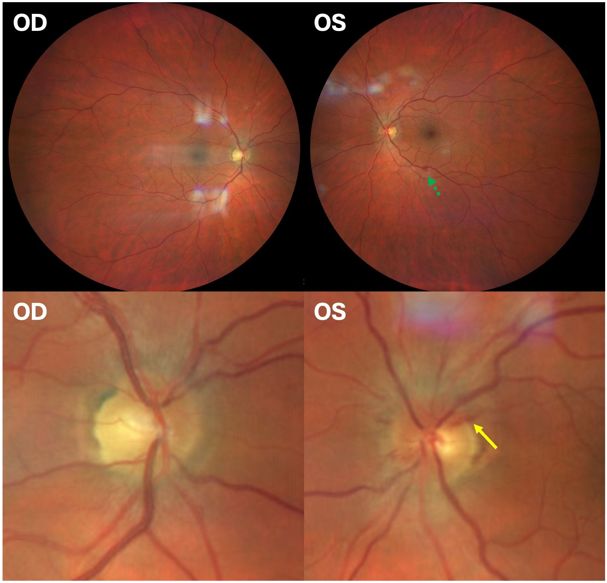 Figure 2. Fundus photographs of the right and the left eye. A retinal hemorrhage adjacent to an inferior retinal vein is noted by a green dotted arrow. The lower images show an enlarged view, demonstrating optic nerve edema and peripapillary hemorrhage (yellow solid arrow). The inferior and temporal Roth spots are not pictured in the left eye.