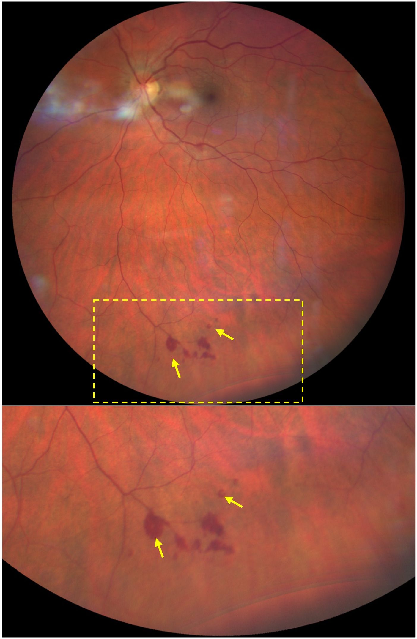 Figure 3. Fundus photograph of the left eye depicting intraretinal hemorrhages and Roth spots. Roth spots are highlighted with yellow arrows. The lower image shows an enlarged view of the concentrated hemorrhages along the inferior peripheral retina. Temporal Roth spot not pictured.