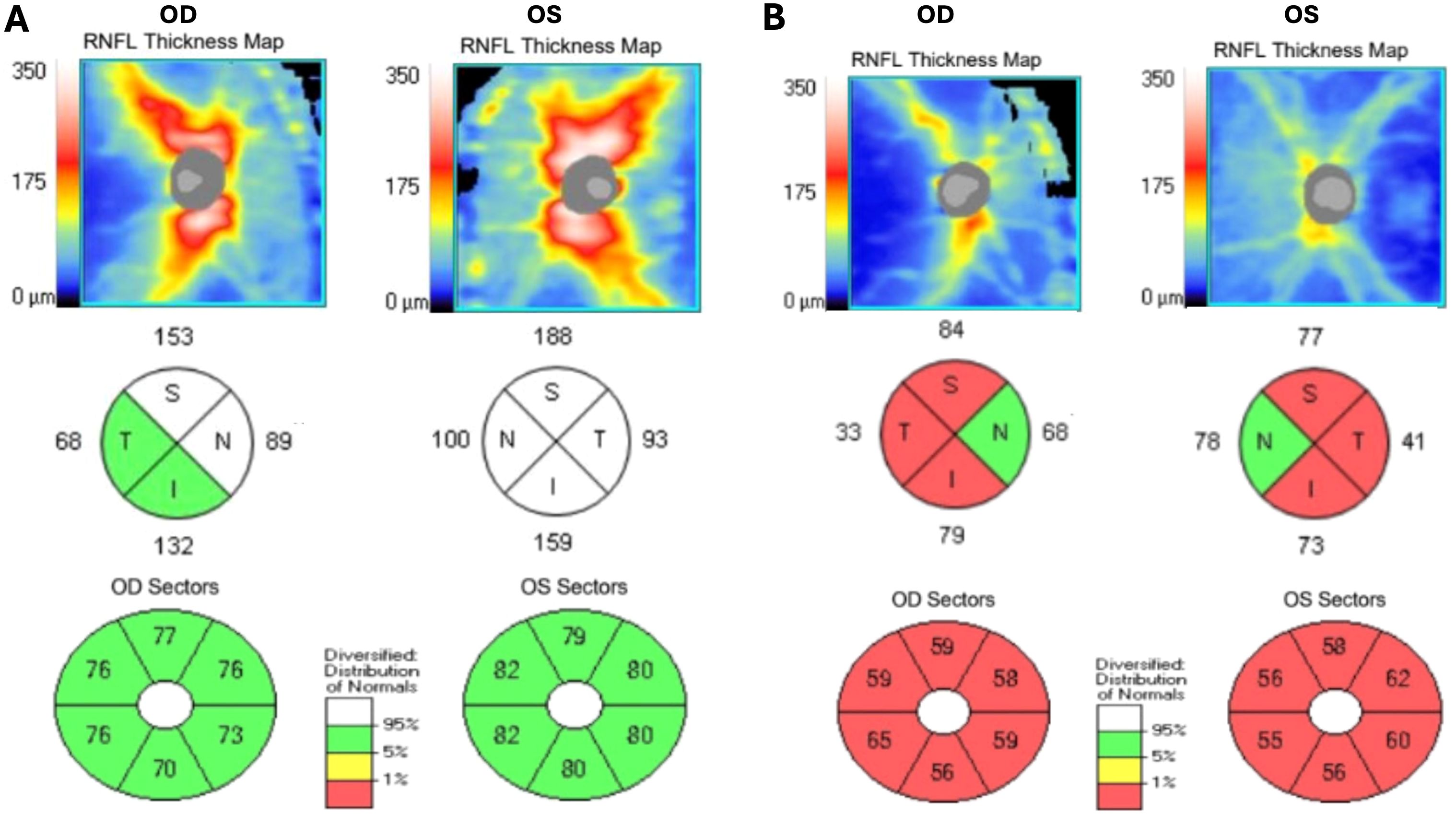 Figure 4. Spectral domain optical coherence tomography demonstrating retinal nerve fiber layer thickening in two quadrants in the right eye and all four quadrants in the left eye on initial presentation (A), with subsequent retinal nerve fiber layer and ganglion cell complex thinning at 8-month follow-up (B).