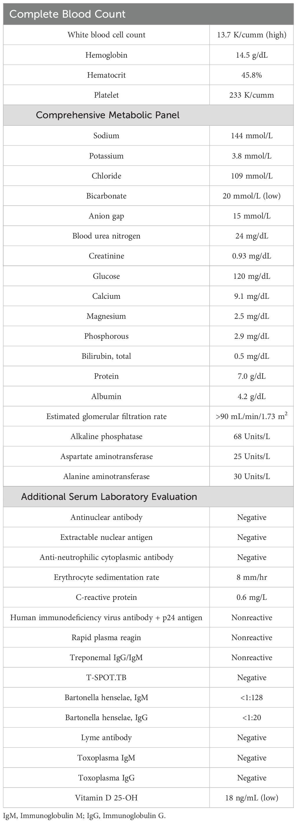 The patient underwent an extensive workup. Notable laboratory findings included a positive MOG immunoglobulin G (IgG) antibody with a serum titer of 1:1,000, which was obtained via fluorescence-activated cell sorting. The initial complete blood count and the complete metabolic panel were unremarkable (Table 1). The serum antinuclear antibody, extractable nuclear antigen, and anti-neutrophilic cytoplasmic antibody tests were negative. The erythrocyte sedimentation rate and the C-reactive protein levels were normal. Further serum laboratory testing for human immunodeficiency virus, tuberculosis, syphilis, Bartonella, Lyme disease, and Toxoplasma gondii was negative. His vitamin D levels were low at 18 ng/mL. Transthoracic echocardiogram showed no evidence of endocarditis. Magnetic resonance angiography and venography of the brain, as well as MRI of the spine, were normal. Cerebrospinal fluid (CSF) analysis showed an elevated nucleated cell count (31/mm3) with 95% lymphocytes and an elevated CD8 count (894 cells/μL). CSF studies including cryptococcal antigen, T. gondii polymerase chain reaction, bacterial culture, and fungal culture were negative. CSF analysis revealed no oligoclonal bands and no significant B-cell population. Opening pressure on lumbar puncture was not recorded.