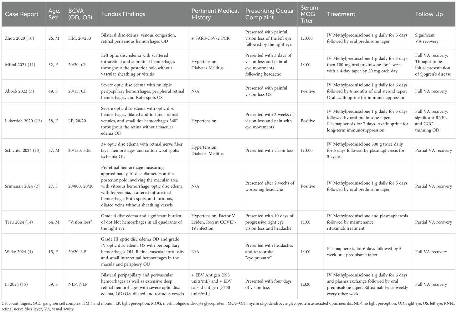To our knowledge, this is only the third case of MOG-ON with concurrent retinal hemorrhages and Roth spots. Until recently, neither retinal hemorrhages nor Roth spots have been recognized features of MOG-ON, and fundus findings beyond optic nerve edema and peripapillary hemorrhages are rare. Retinal hemorrhages in MOG-ON may be underreported in the literature given their lack of specificity. A PubMed literature review identifying cases of MOG-ON associated with retinal hemorrhages or Roth spots before 30 March 2025 yielded 107 results. Among these, only nine cases (8.4%) documented hemorrhages outside of the peripapillary region. Notably, five of these nine cases had systemic comorbidities, including diabetes, hypertension, and coronavirus disease 2019 (COVID-19) (Table 2). Only two cases (1.8%) documented Roth spots in patients with MOG-ON, both in female patients aged 27 and 49 years, respectively (2, 3). Similar to these reports, the presentation of our patient prompted an extensive systemic evaluation, underscoring the diagnostic challenge posed by the fundoscopic findings.
