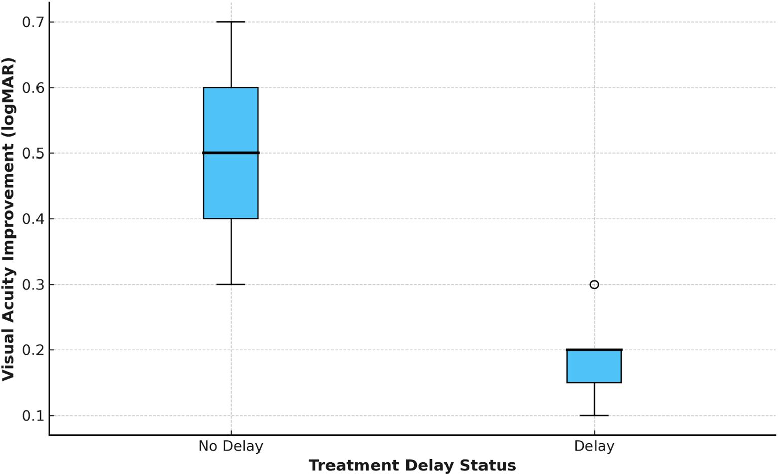 Figure 2. Best-corrected visual acuity (BCVA) improvement by treatment delay. Boxplot showing change in BCVA (logMAR) at 3 months, stratified by treatment delay status (delay = initiation of corticosteroids >14 days after symptom onset; no delay = ≤14 days). Patients without treatment delay demonstrated greater median improvement compared to those with delay.