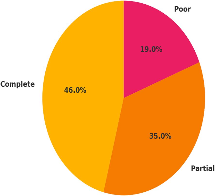 At three months post-diagnosis, 46 patients (46%) made a full recovery, while 35 patients (35%) made a partial recovery, and 19 patients (19%) had poor recovery outcomes. The patients who had no delay to treatment were significantly more likely to fully recover (66.7%) compared to the patients who had delays (31.0). Moreover, poor recovery was almost three times more common in the treatment delay group (25.9% vs. 9.5%), which speaks to the impact of early intervention (Table 3; Figure 3). It is important to emphasize that only short-term (3 months) outcomes were available; thus, recovery over a longitudinal course beyond this time could not able to be assessed.