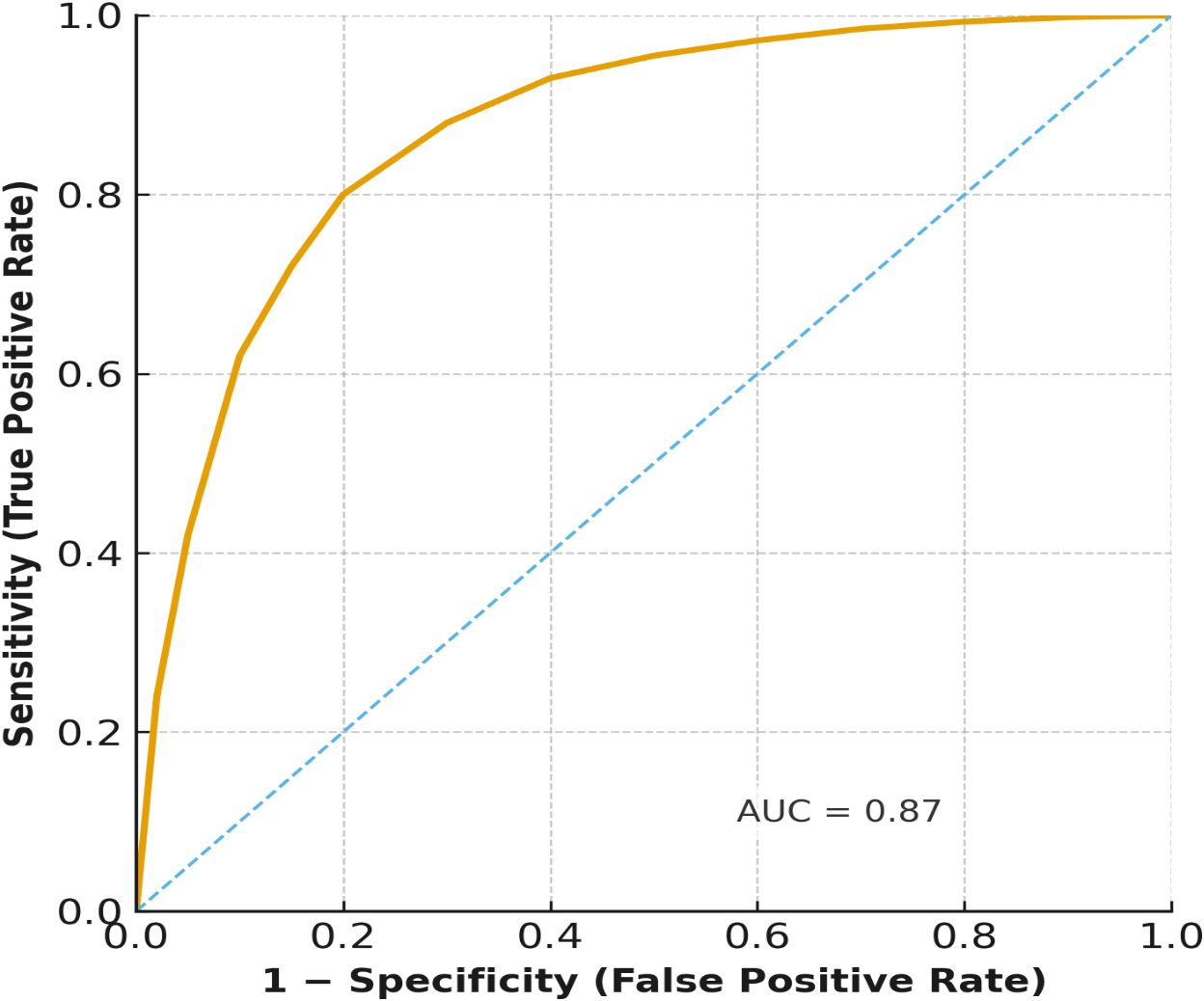 Figure 4. Receiver operating characteristic (ROC) curve for the prediction of complete recovery by treatment delay. The ROC curve illustrates the prognostic ability of treatment delay in predicting complete visual recovery at 3 months. The area under the curve (AUC = 0.87) indicates strong discrimination between patients who achieved complete recovery and those who did not.