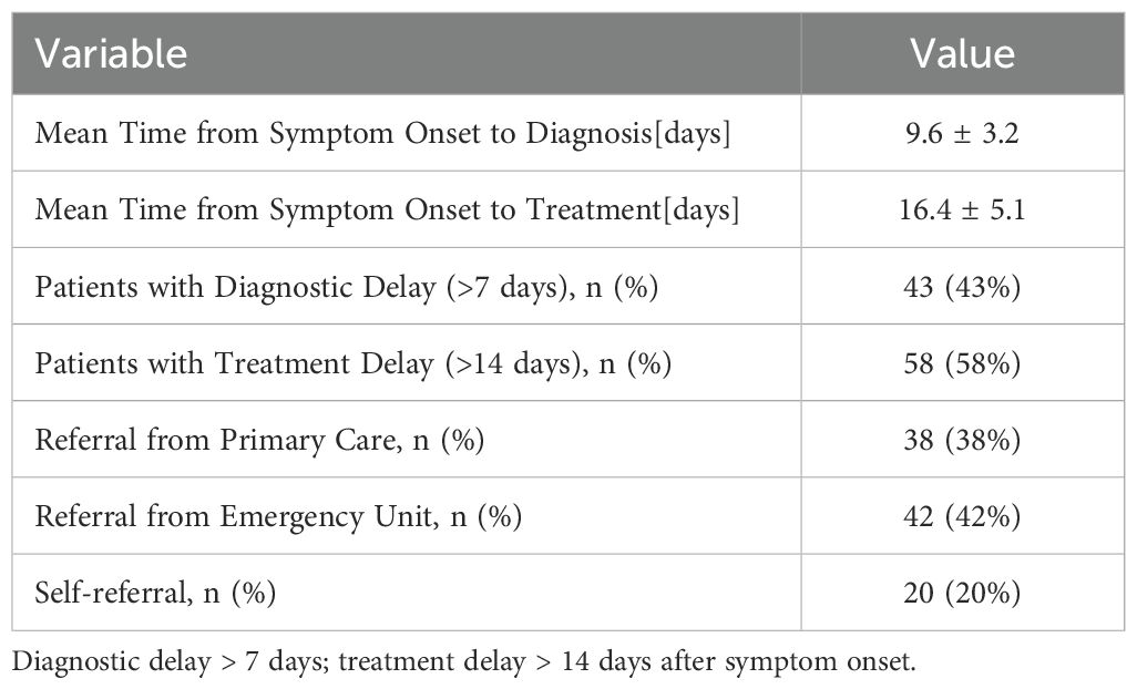 The mean time from the start of symptoms to diagnosis was 9.6 days (± 3.2), and the mean time from diagnosis to the start of treatment with corticosteroids was 16.4 days (± 5.1). For 100 patients, 43% experienced a diagnostic delay (>7 days from the onset of symptoms to diagnosis), while 58% of patients had treatment delays (>14 days from the onset of symptoms to the first corticosteroids). The patients with delayed therapy had significantly lower median BCVA improvement (Figure 2). The majority of the patients (69%) also received treatment after the time elapsed of the empirically defined treatment window to initiate treatment, demonstrating systemic inefficiencies in specialized referral pathways and access to pre-existing systems of care (Table 2).