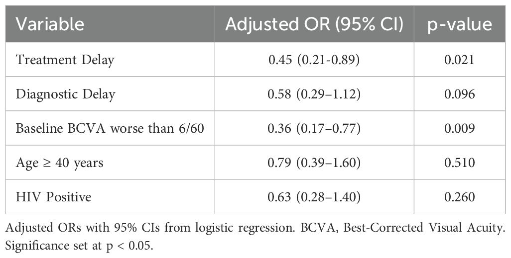 A multivariable logistic regression model was used to evaluate the association between treatment delay and odds of complete visual recovery stratified by the following key confounders: baseline BCVA, age, sex, and comorbidities (HIV, diabetes, and hypertension). A p-value <0.05 was considered statistically significant.