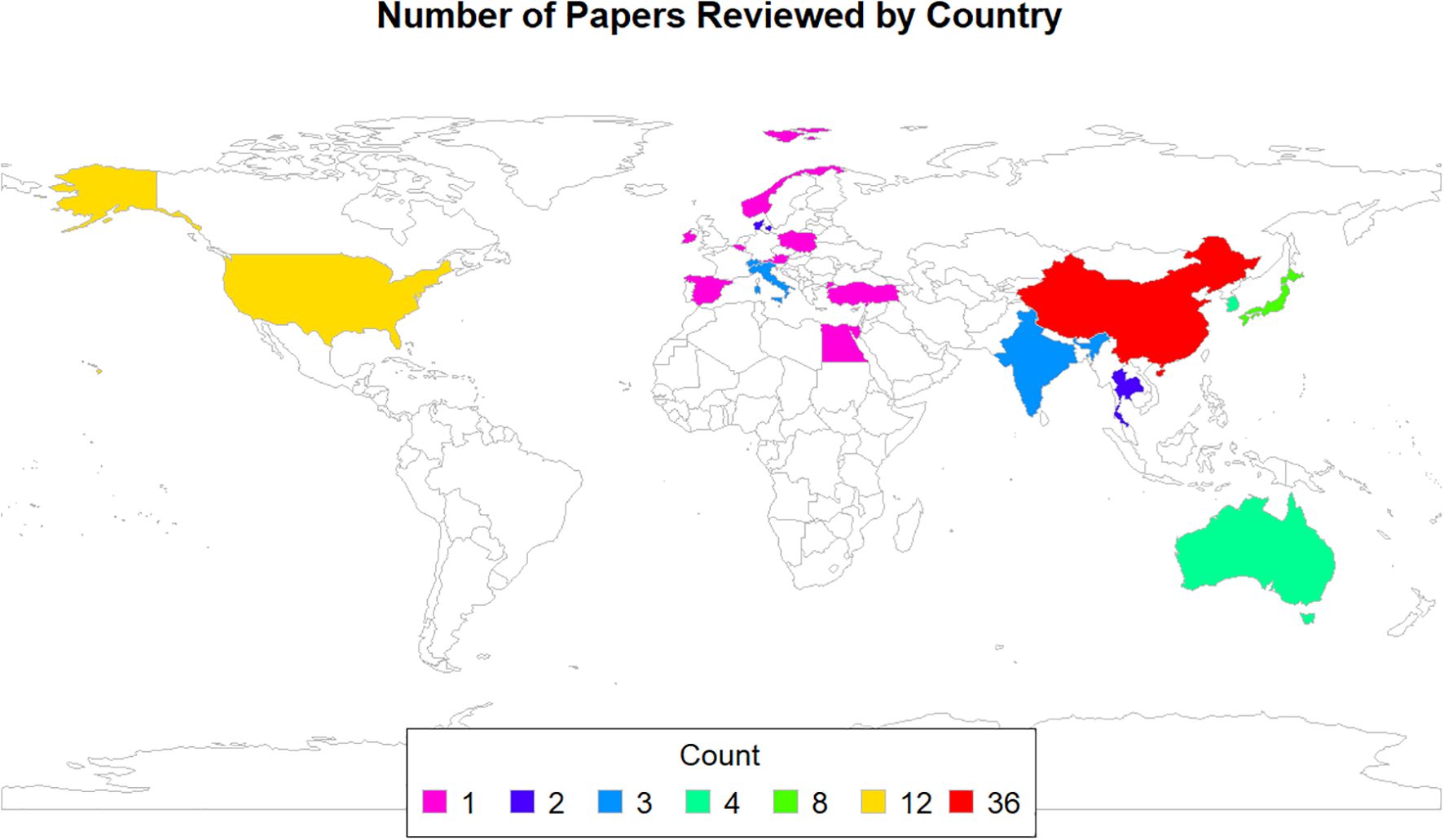 In terms of country of origin, as illustrated in Figure 1, 36 of the articles were published by researchers in China, 12 were conducted in the USA, 8 in Japan, 4 each in Australia and Korea, 3 each in India, Italy, and Switzerland, 2 each in Denmark and Thailand, and 1 each in Austria, Belgium, Egypt, Hong Kong, Ireland, Norway, Poland, Singapore, Spain, the Gambia, and Turkey. Additionally, one study was a multicenter collaboration between Spain and Italy.