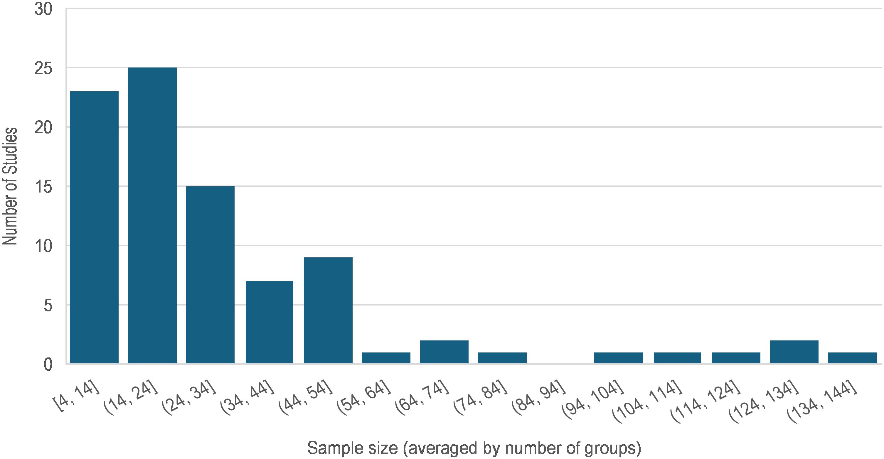 Reasons for omitting sample size calculations included the pilot nature of the study, which aimed to provide preliminary data for future research, or the descriptive nature of the study, which lacked a formal null hypothesis (41, 43, 71, 83). Notably, 73 articles (82.0%) did not perform sample size calculations or provide a justification for their chosen sample size. Nonetheless, many of these studies acknowledged their small sample size as a limitation, highlighting this as a recurring challenge in the field (12, 28, 35–37, 43, 46, 47, 50, 57, 61, 65, 78, 84, 89, 90, 93).