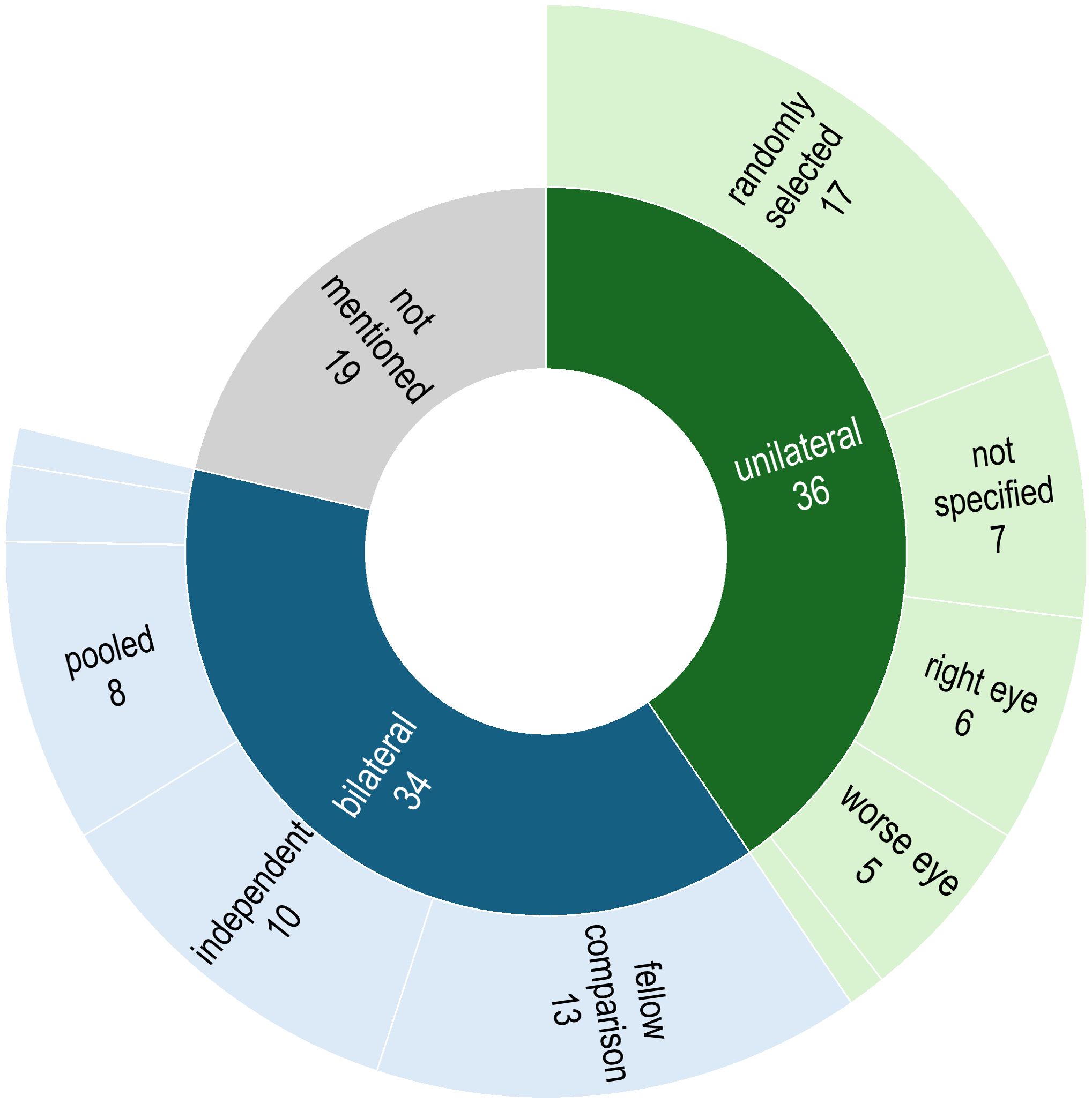 In this review, the choice of unilateral or bilateral sampling approach was either explicitly stated or could be deduced in 70 (78.7%) of the articles (Figure 3). Of these, 36 studies performed sampling from only one eye; this was either a randomly-chosen eye (n = 17), the right eye (n =6), the left eye (n = 1), the eye receiving treatment (n = 5), or the selection was not specified (n = 7). In 34 studies, samples were obtained from both eyes of each participating individual; these were used for performing fellow eye comparisons (n = 12), counted as independent samples to increase the overall sample size (n = 11), pooled as one sample (n =8), collected separately to perform downstream analysis with the one generating a higher DNA yield (n = 1), or it was unclear whether they were treated independently or pooled (n = 2). In the remaining 19 articles (16.9%), it was not clear whether sampling was done unilaterally or bilaterally.