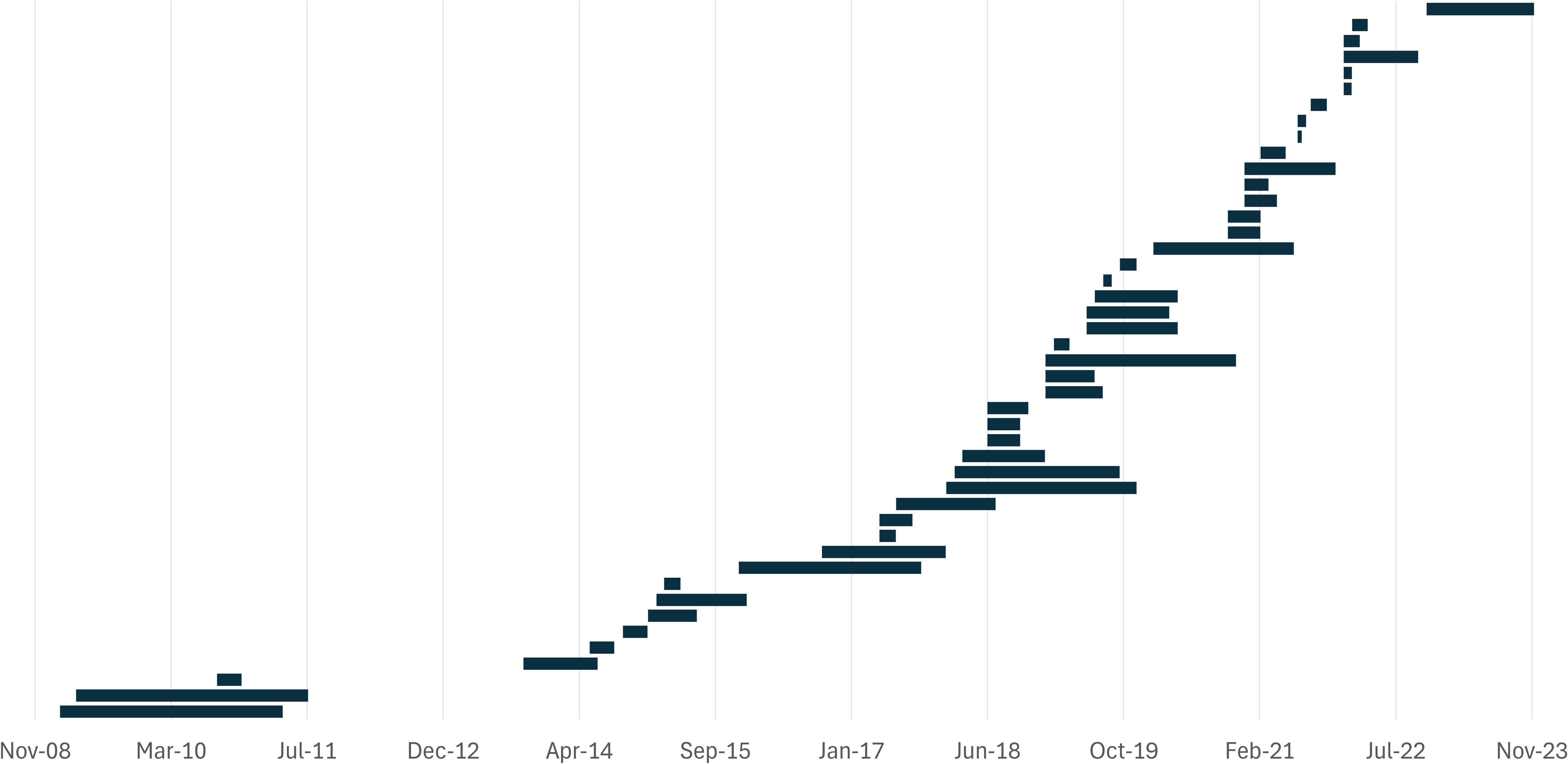 The study time frame was specified as the start and end month in 45 articles (50.6%), 3 articles reported the duration, and 3 reported the years in which the study was done. In the 48 studies that provided information about the study duration, the sampling periods ranged from 2 weeks to 28 months (median = 4.5 months) (Figure 4). Although very few of the studies were longitudinal, 10 studies had sampling periods between 3 and 6 months, 11 were conducted over 6 to 12 months, and 10 had a time frame longer than 12 months. The remaining 41 studies (46.1%) did not provide information about the study duration, suggesting a cross-sectional study design at an undefined point in time. Moreover, the sampling time of the day was specified in only four articles (4.5%), all of which stated that samples were collected in the morning.