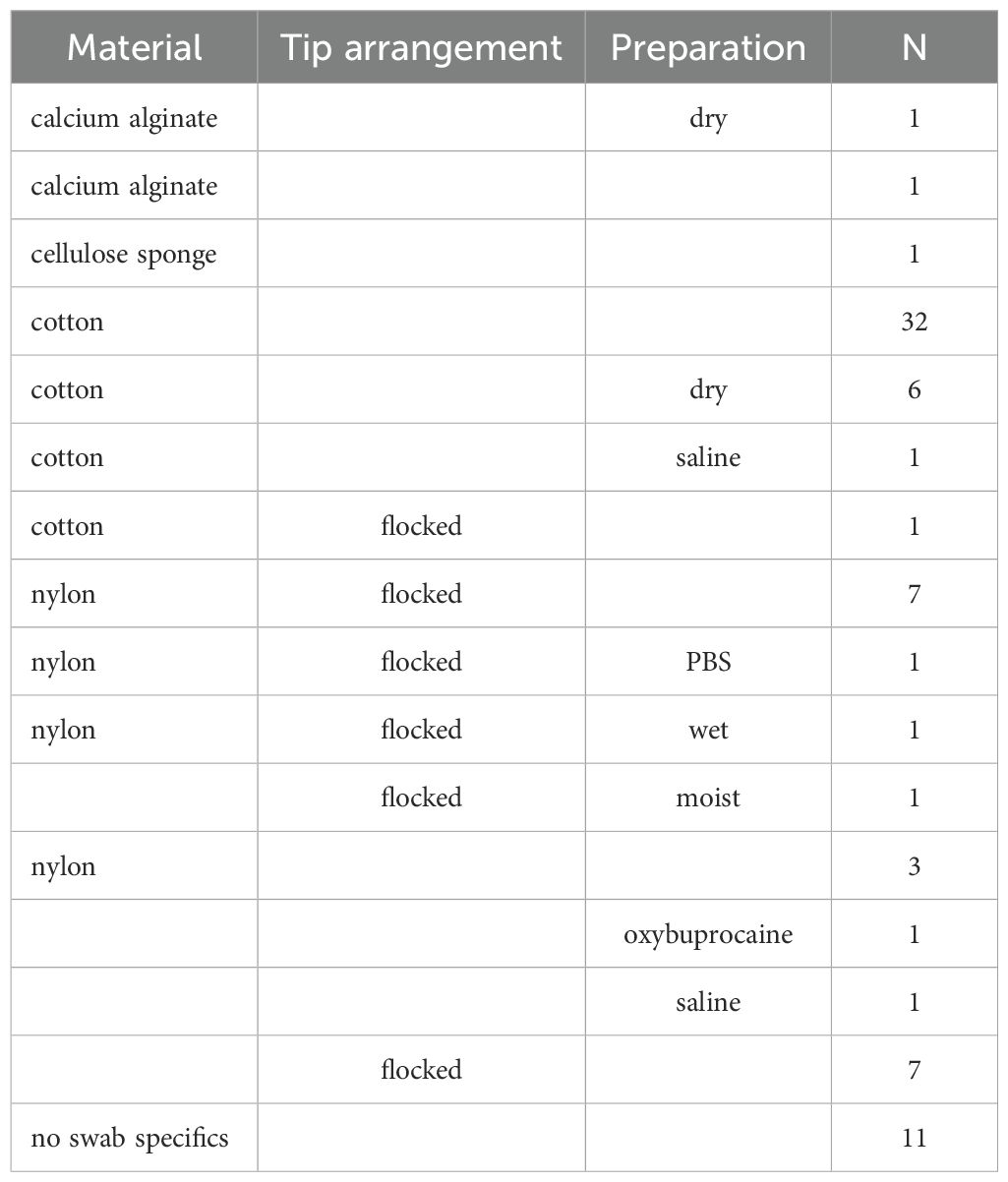 Information about the use of sample transport media was provided in 71 (79.8%) of the reviewed articles. In 38 of these articles, samples were placed in tubes with no transport media or preservation solution. In the other 32 studies, the collected samples were placed in various types of media such as lysis solution (n = 6), phosphate-buffered saline (n = 5), liquid Amies (n = 4), DNA protective solution (n = 4), DNA/RNA Shield (n = 3), DNase-Free double-distilled water (n = 1), Stuart’s transport medium (n = 1), RNAlater (n = 1), thioglycollate broth (n =1), normal saline (n = 1), swab solution (100 mM Tris-HCl [pH 8.0], 30 mM EDTA [pH 8.0], and 0.5% sodium dodecyl sulfate) (n = 1), ST solution (0.15 M NaCl and 0.1% Tween‐20) (n = 1), stringent wash 1 solution and glass beads (n = 1), and unspecified “transport medium” (n = 2). The quantity of the transport medium, as reported in 15 of these articles, ranged between 250 µl (Dacron swab placed in RNAlater) and 1 ml (cotton swab placed in phosphate-buffered saline).