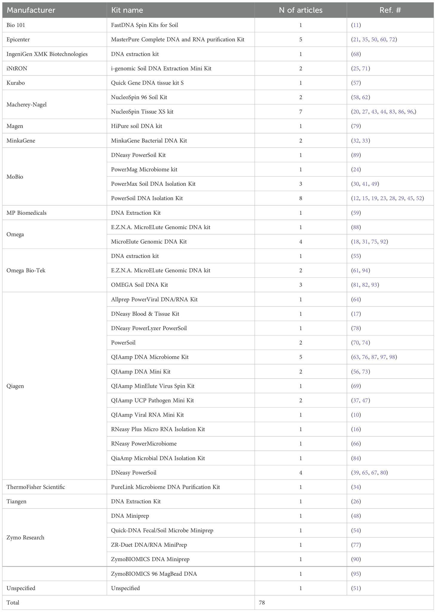 Table 2. List of various DNA/RNA extraction kits and their manufacturers used in 78 of the reviewed studies.