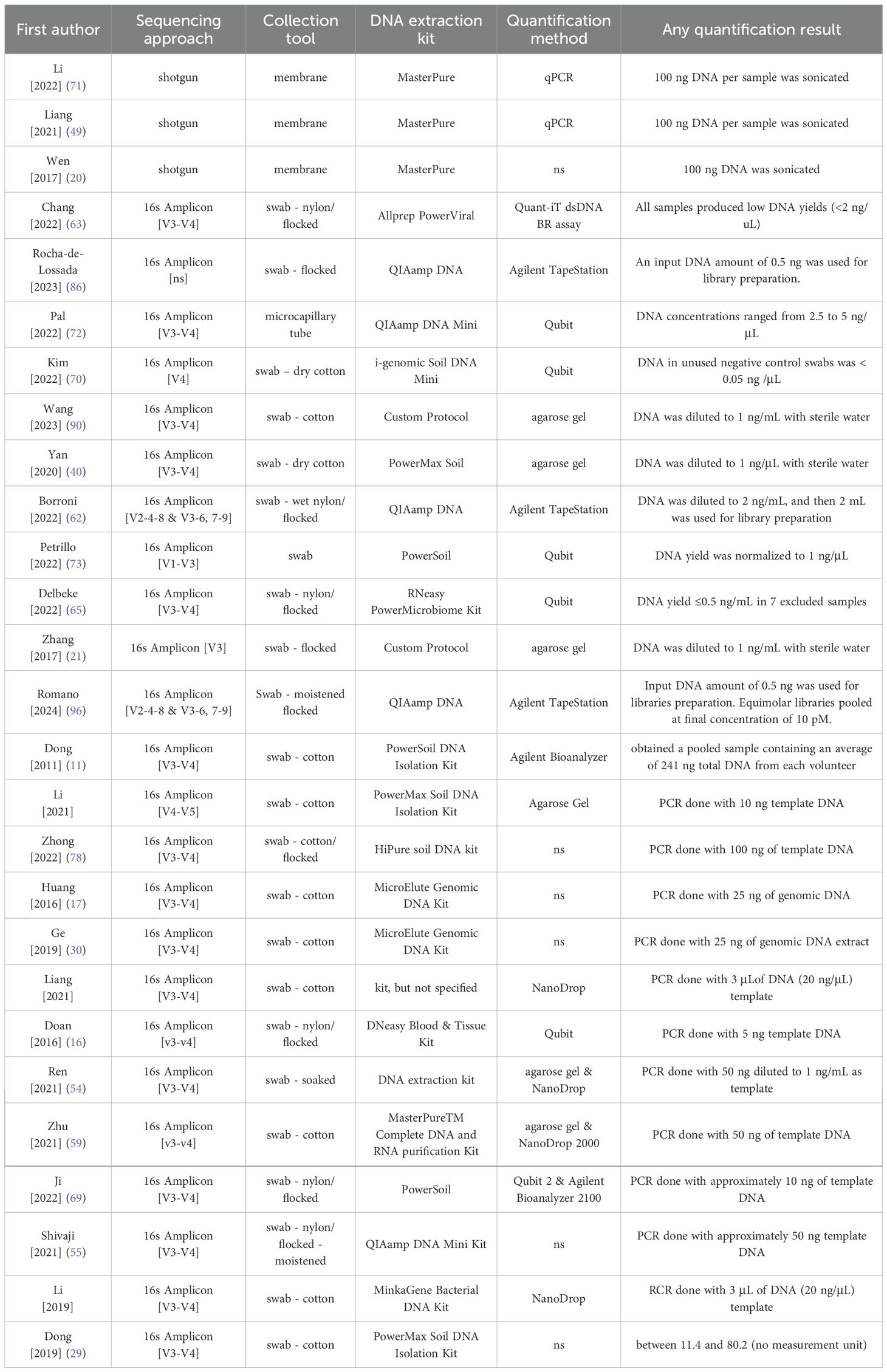 One of the most significant gaps identified in this review was the inconsistent reporting of DNA quantities. While most studies mentioned checking their DNA, the actual yields were rarely provided. Among the few studies that reported quantification results, DNA yields varied considerably. Chang et al. (63) reported that all their samples yielded less than 2 ng/μL, while Pal et al. (72) documented DNA concentrations ranging from 2.5 to 5 ng/μL. In another study, Delbeke et al. (65), who incorporated an additional lysis step in their DNA extraction protocol, excluded about 30% of their samples due to DNA yields of ≤0.5 ng/mL (0.0005 ng/μL) being too low for sequencing. It is likely that other studies encountered similar issues with low-yield samples, but these were not explicitly reported, highlighting another significant gap in the literature.