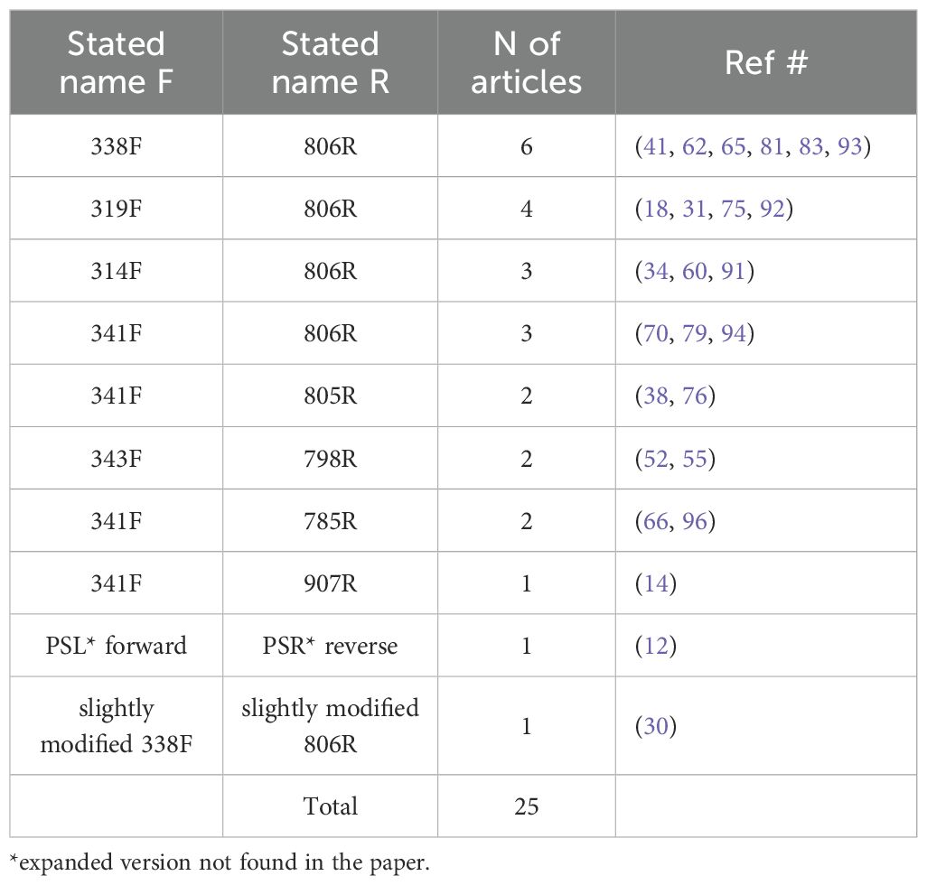 In 77 (86.5%) of the reviewed studies, amplicon sequencing of the 16S rRNA gene was performed, and the remaining five studies conducted shotgun sequencing (n = 11) or RNA-seq (n = 1). In the former group, the target regions were V1-V2 (n = 3), V1-V3 (n = 4), V3 (n = 2), V3-V4 (n = 44), V4 (n = 11), V4-V5 (n = 4), V5-V6 (n =1), or the full or almost full length of the gene (n =5); the 16S region was not specified in the other 3 studies. Among the 44 studies that targeted the V3-V4 region, some provided the primer name (n = 25) (Table 4), primer sequences (n = 29), or both name and sequence (n = 21); primers were not mentioned or specified in the other 11 articles.