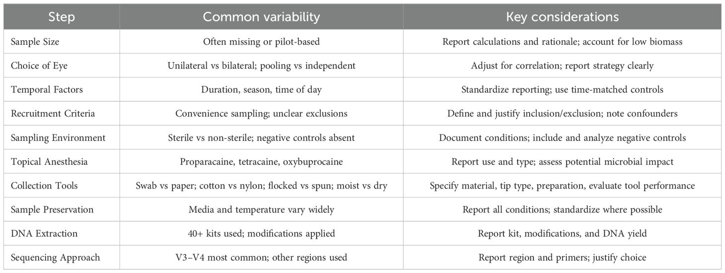 The inconsistent and often absent reporting of temporal factors, such as study period and duration as well as sampling time of day, poses a significant challenge to the interpretation and comparison of ocular surface microbiome studies. Variations in environmental conditions or tear film dynamics across seasons and times of day can yield divergent results. For instance, Zhou et al. (14) conducted a 27-month study in the Gambia, revealing significant differences in conjunctival microbiome composition between dry and wet seasons. Such findings highlight the impact of temporal factors and the need for careful documentation.