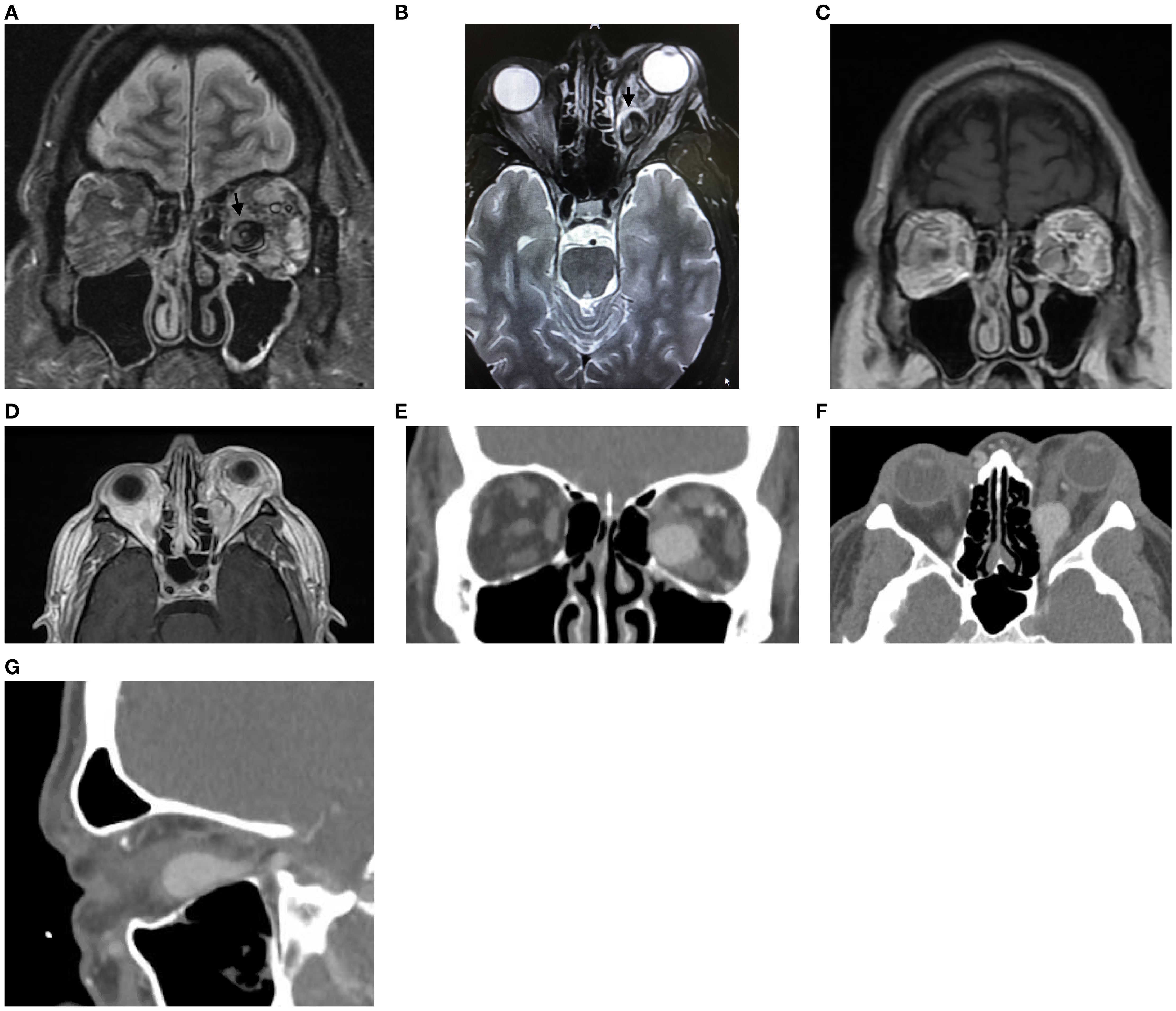 Figure 1. (A) Coronal transverse relaxation time short tau inversion recovery magnetic resonance image demonstrating a large venous aneurysm in the inferomedial left orbit. (B) Axial transverse relaxation time short tau inversion recovery magnetic resonance image demonstrating a dilated venous aneurysm in the posterior medial left orbit (arrow) with associated edema of the medial and lateral rectus muscles. (C, D) Longitudinal relaxation time post-gadolinium magnetic resonance coronal (C) and axial (D) images demonstrating enhancement of the venous aneurysm in the inferomedial left orbit. (E–G) Computed tomography angiography with intravenous contrast in coronal (E), axial (F), and sagittal (G) views demonstrating enhancement of the venous aneurysm, which extends to the orbital apex.