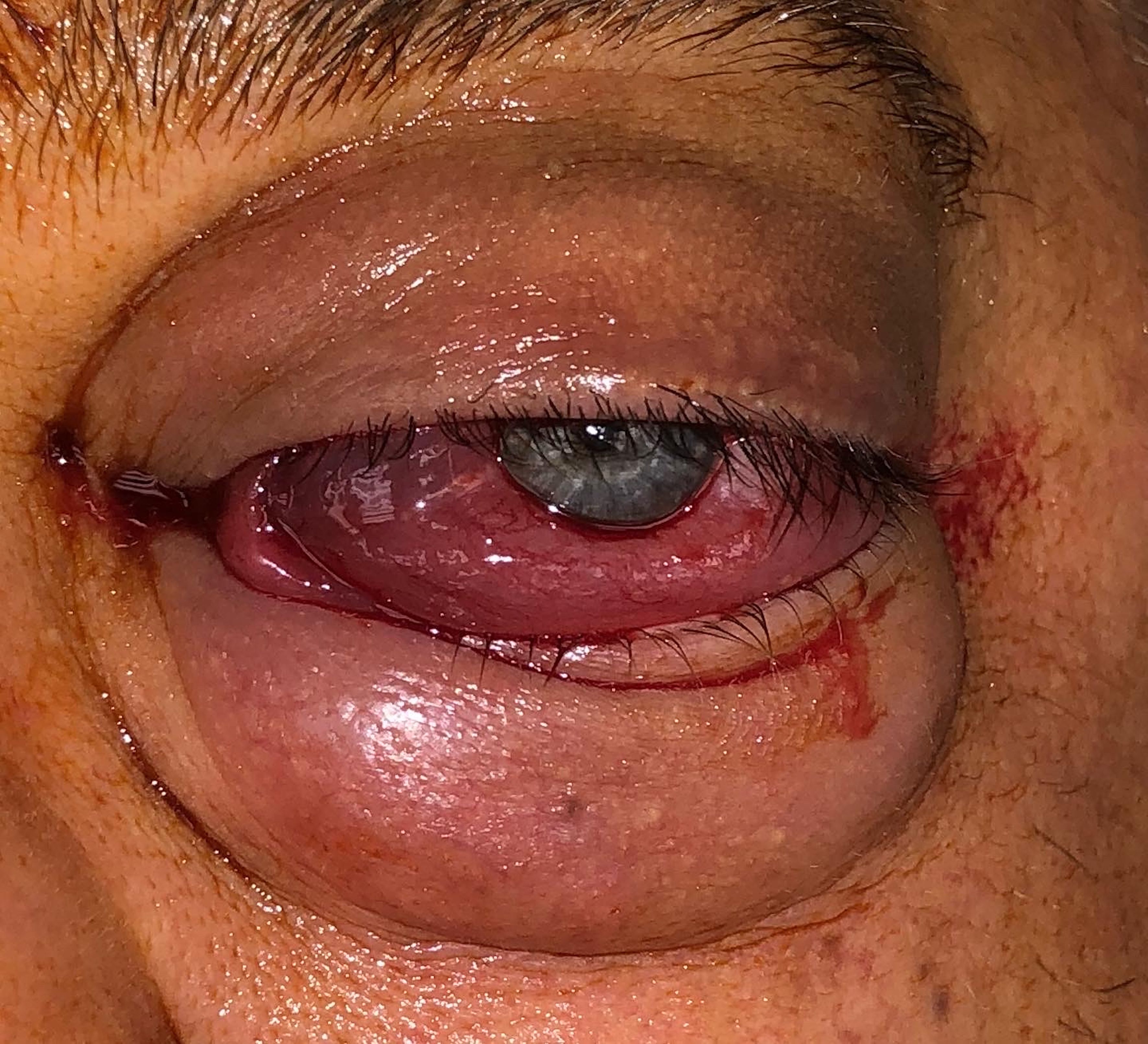 Figure 2. Pre-operative external photograph of the left eye demonstrating significant orbital congestion and chemosis. Photograph was taken on the day of intervention.