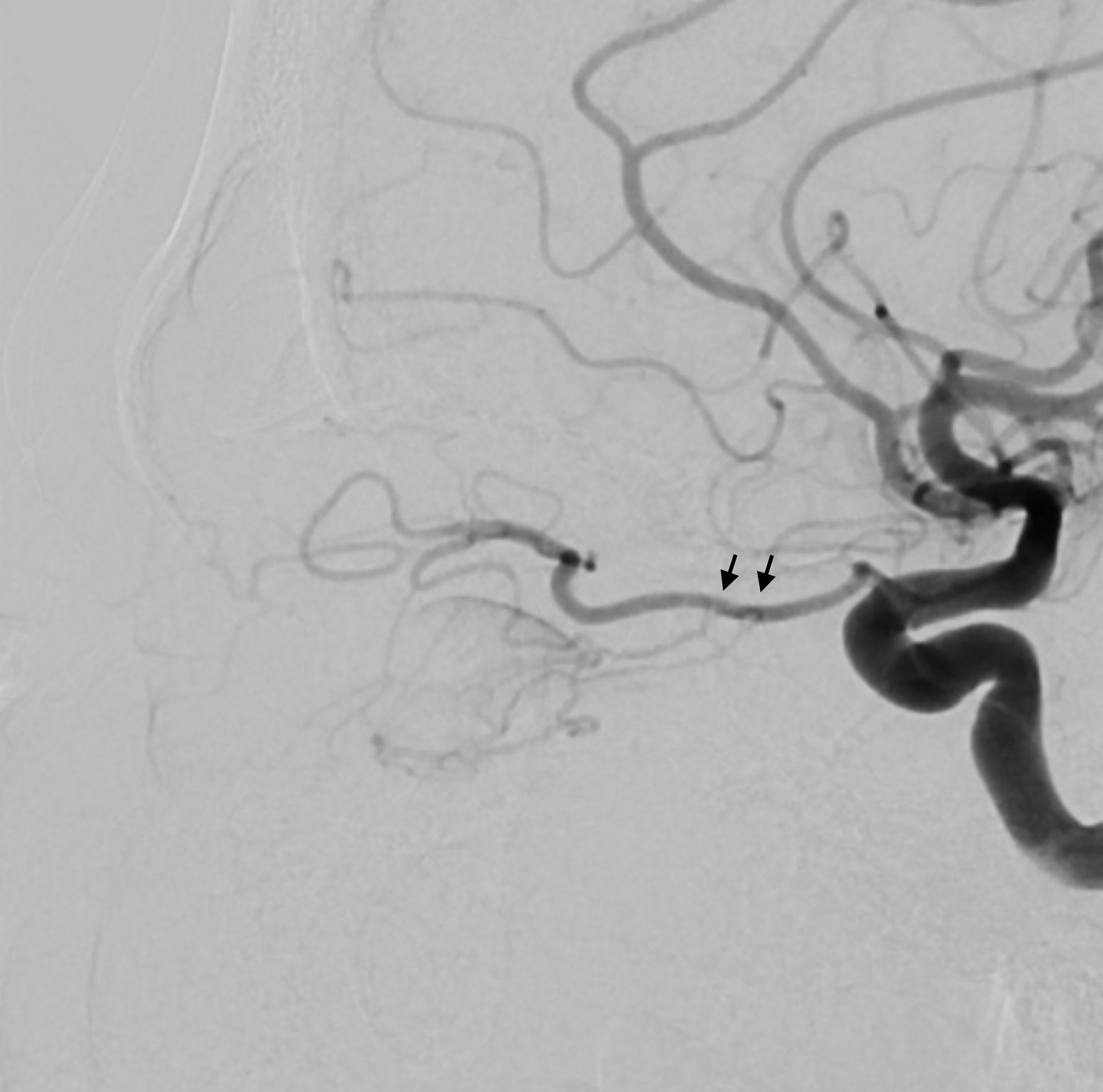 Figure 3. Lateral view of the angiogram after internal carotid artery injection demonstrating feeding arterioles off the proximal ophthalmic artery (arrows).