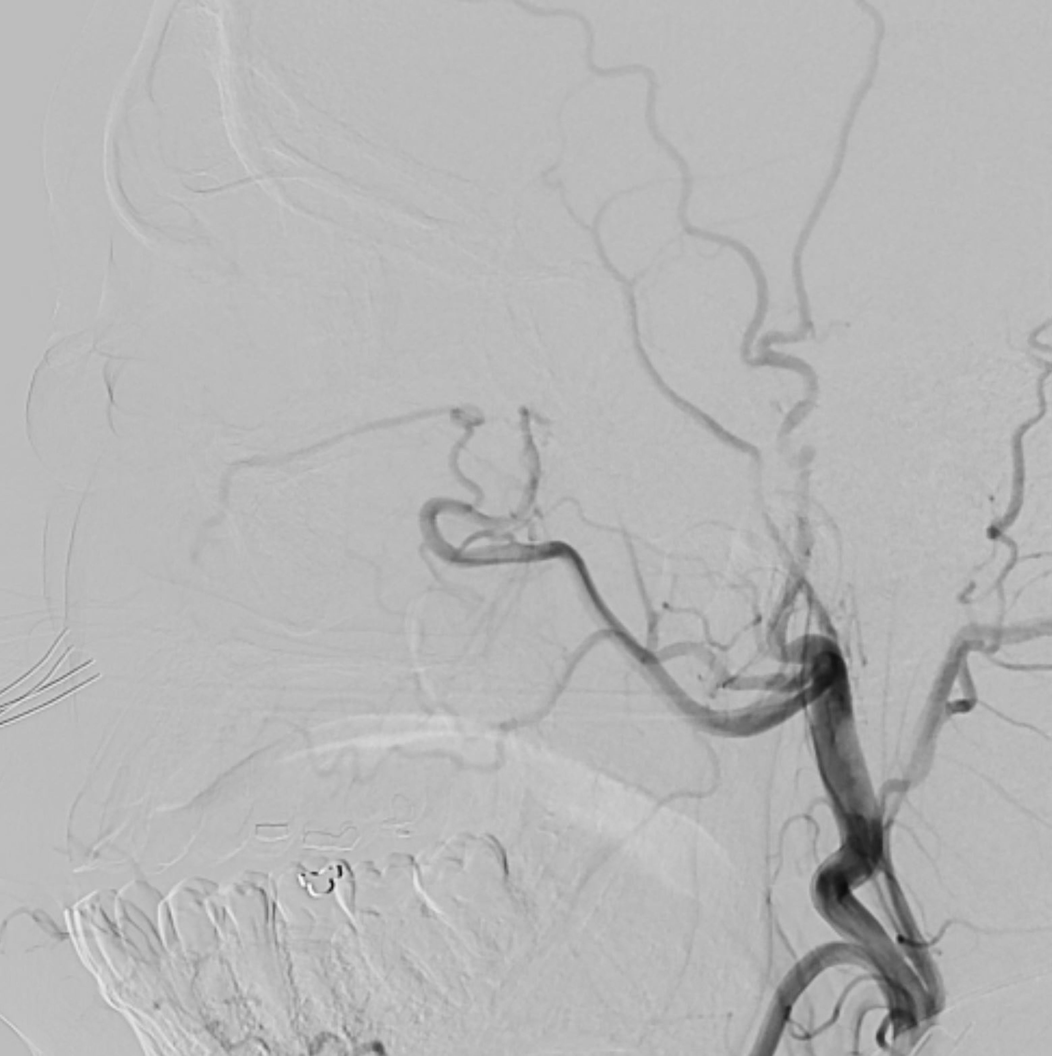 Figure 4. Lateral view of the angiogram after external carotid artery injection demonstrating no feeding of the venous aneurysm.
