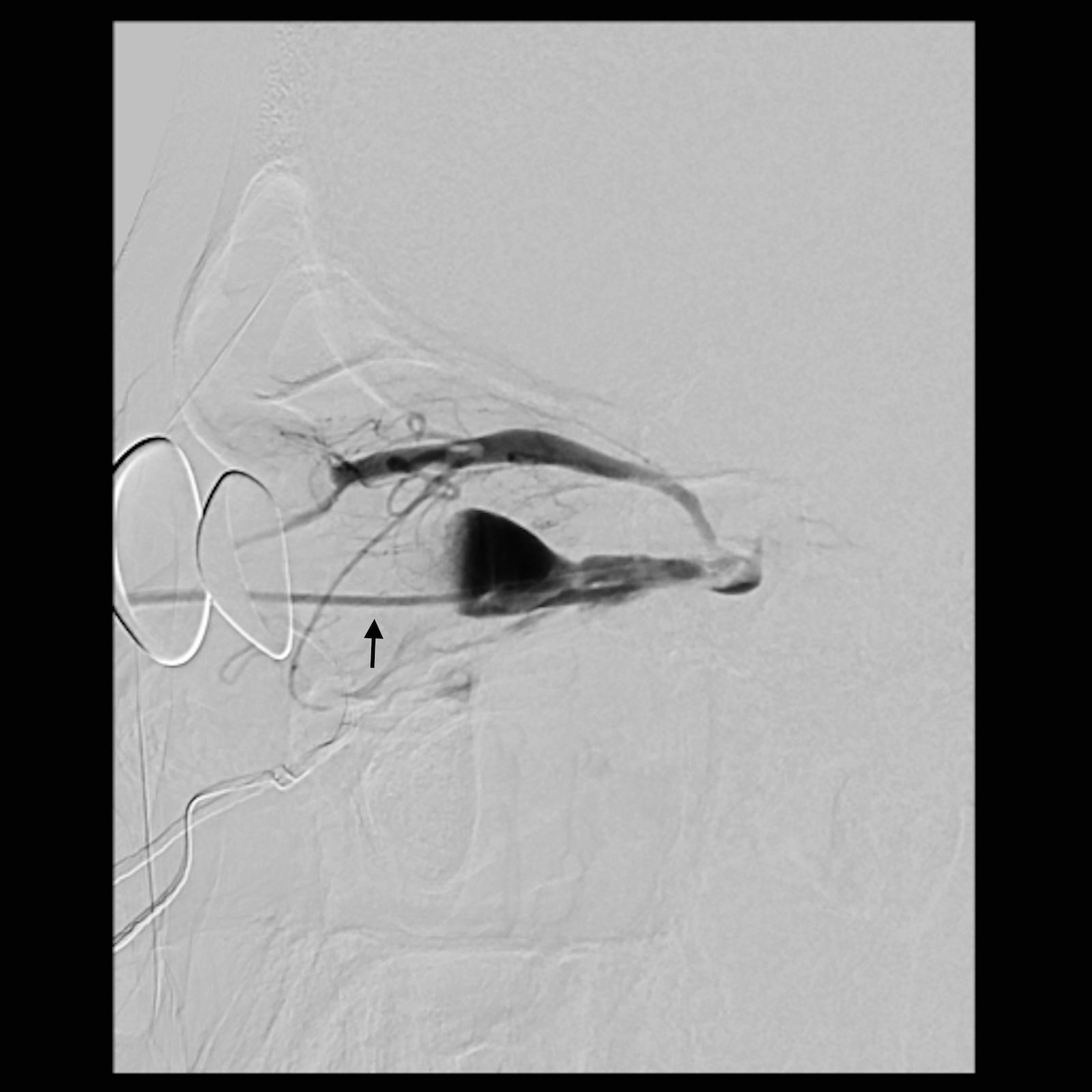 Figure 5. Lateral view of the angiogram demonstrating a percutaneously placed catheter (arrow) in the dilated venous aneurysm of the fistula. There is contrast outflow superficially without direct connection to the cavernous sinus.