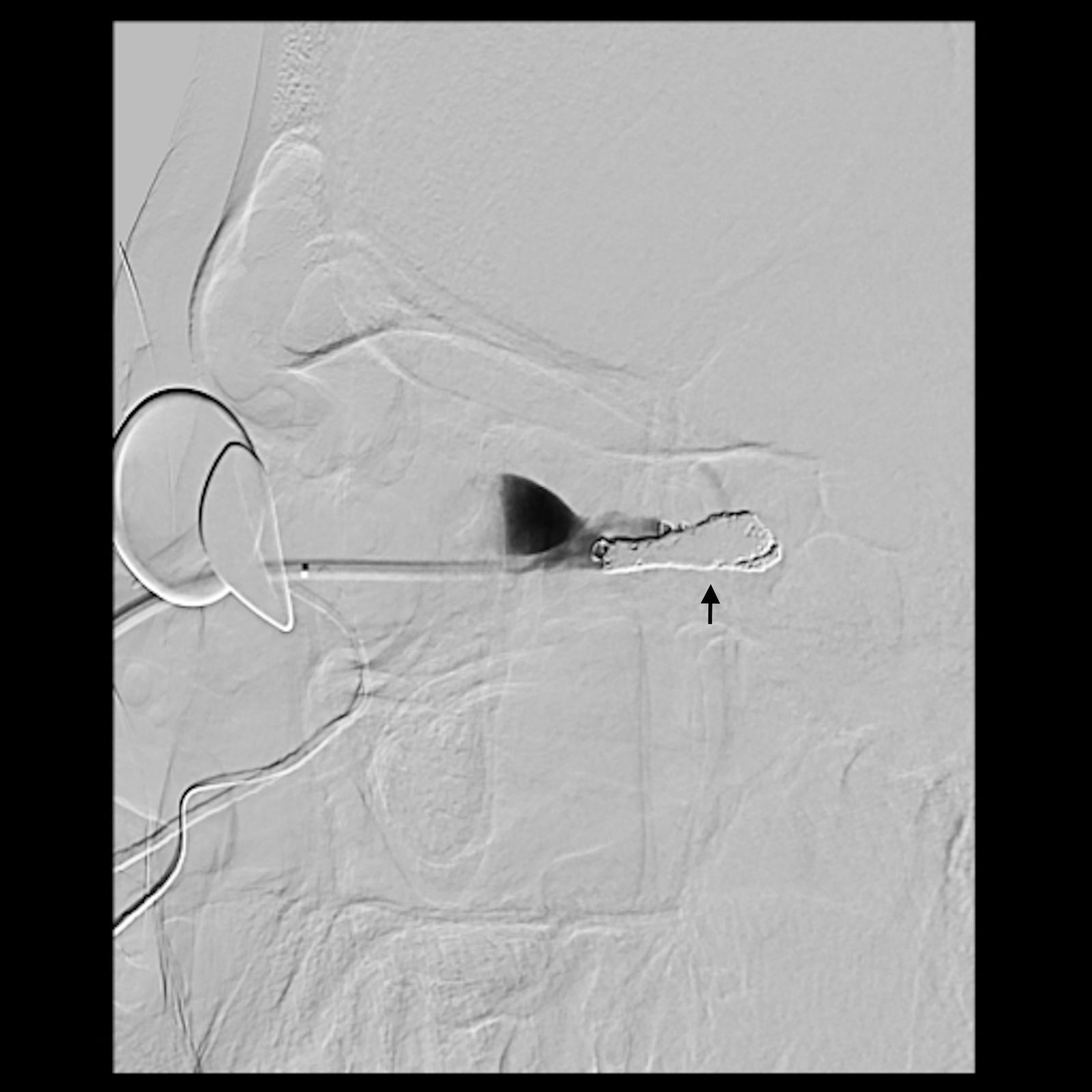 Figure 6. Lateral view of the angiogram after coiling of the venous outflow tracts of the fistula demonstrating complete occlusion of the outflow tracts. Arrow indicates location of coils.