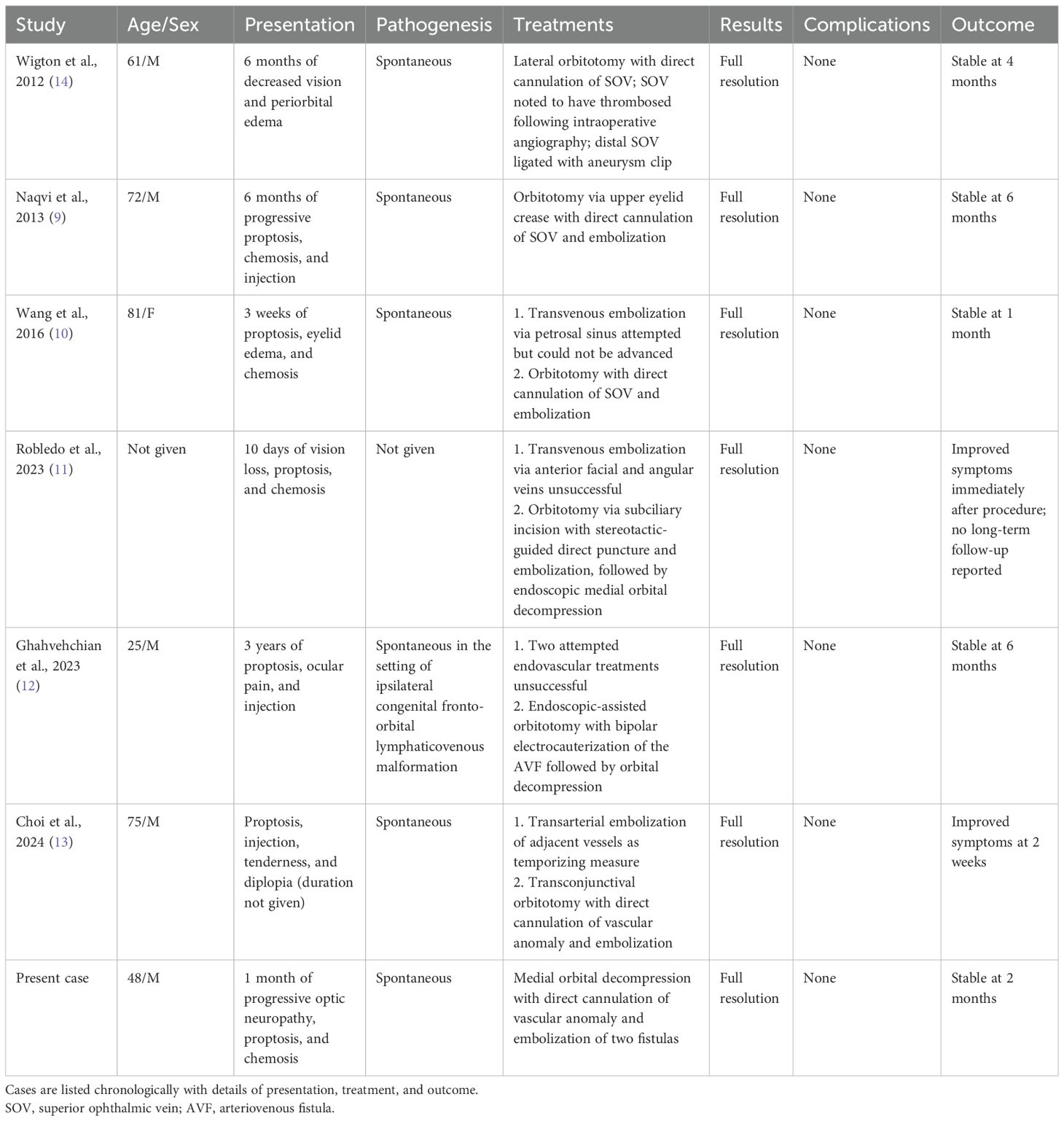 Most recently, Pathuri et al. published a review of the literature on this subject, organized by treatment modality, and Krylova and Hauck published a review of the literature on this subject, including dural arteriovenous fistulas (2, 5). The authors performed a literature search of PubMed from 1978 to August 2025 for cases of pure intraorbital arteriovenous fistulas with documented intervention and outcome. Dural arteriovenous fistulas and arteriovenous malformations were excluded. Among 29 identified cases, including the present case, 14/29 (48%) were treated with transvenous embolization alone (2, 3, 6–8), 7/29 (24%) were treated with orbitotomy combined with direct fistula treatment (9–14), 4/29 (14%) were treated with craniotomy (15–18), and 4/29 (14%) were treated with transarterial embolization (18–21). Cases in which orbitotomy was performed are summarized in Table 1. In addition, we noted 18 reported cases of spontaneous resolution spanning a variety of etiologies (2, 18), although 5/18 (28%) cases had reported visual decline. Given the limited published experience with this rare entity, clear indications for observational management are yet to be defined.