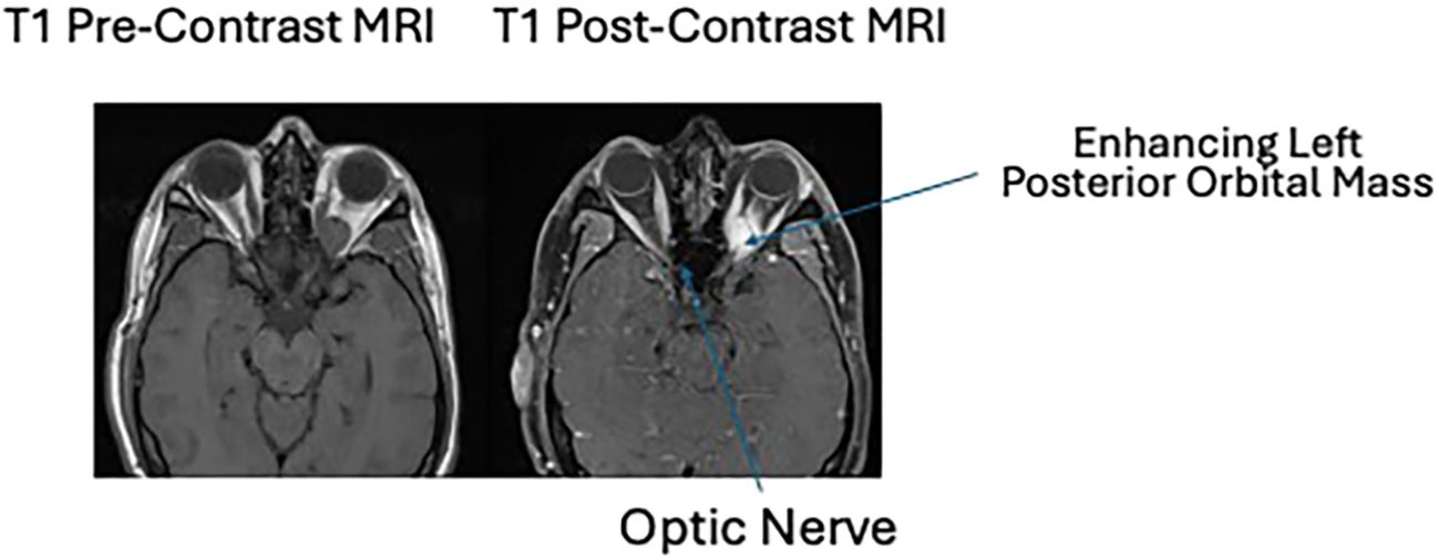 Figure 2. T1 pre- and post-contrast MRI imaging showing an enhancing left posterior orbital mass centered in the posterior intraconal fat just anterior to the optic nerve canal. This mass measures 2.3 × 1.5 × 1.3 cm, previously 2.3 × 1.4 × 1.3 cm when remeasured similarly. The lesion contains a single internal flow void. There is again inferior displacement of the optic nerve which is at least partially encased by the mass. At the orbital apex, the mass is inseparable from the extraocular muscles.