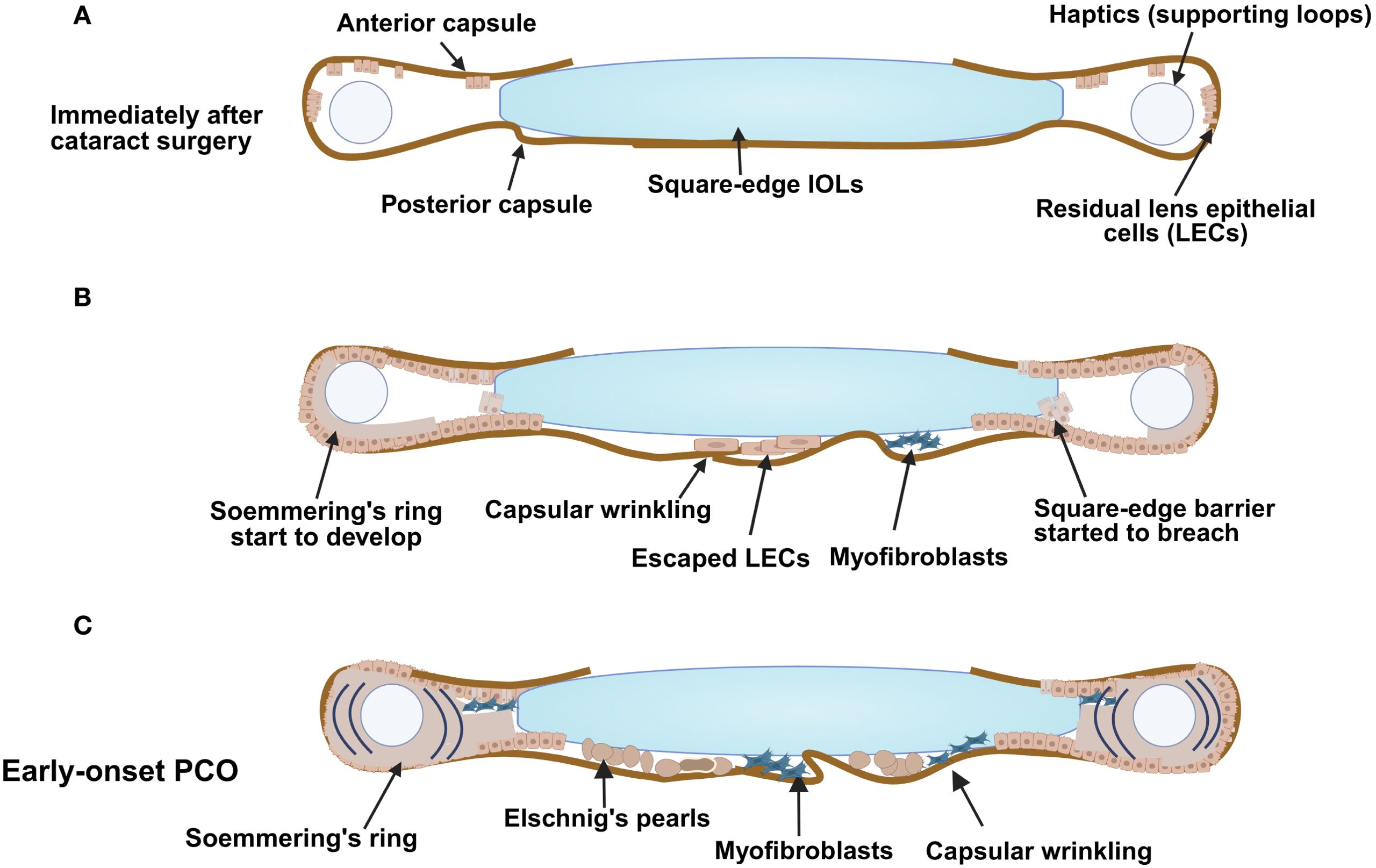 Figure 1. Early-onset PCO development following cataract surgery. An illustration demonstrating (A) the capsular bag early after surgery, (B) cells start to gather at the posterior region (some pearl-like components and some myofibroblasts) and development of matrix deformation/capsular wrinkling; Soemmering’s ring also starts to appear and (C) the changes that result from a combination of fibrotic and regenerative PCO with formation of Elschnig’ s pearls and Soemmering’s ring. Figure created with Biorender.