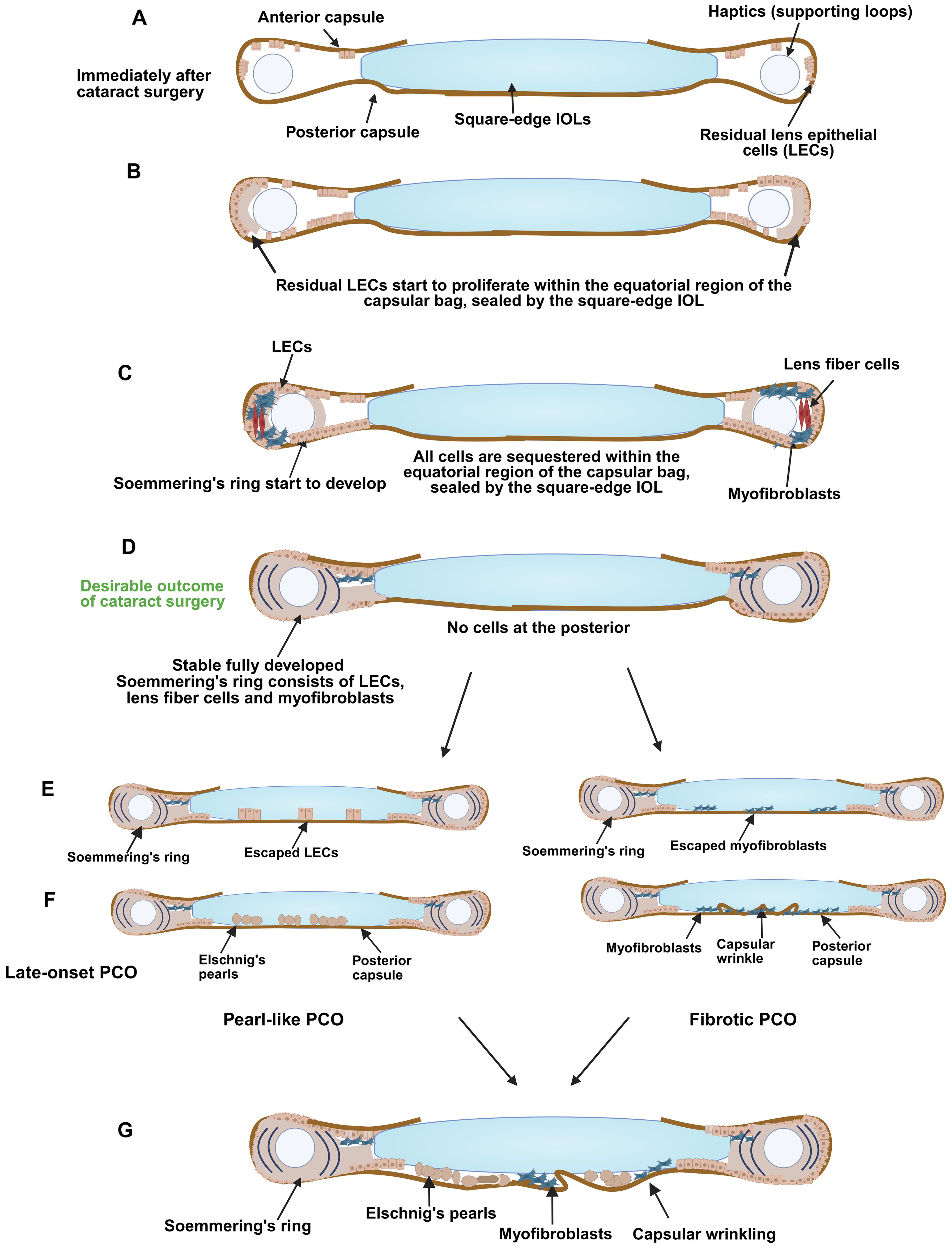 Figure 2. Development of late-onset PCO. A schematic diagram illustrating (A) the capsular bag early after surgery, (B) LECs start to proliferate and populate the areas of denuded peripheral lens capsule that they can access, (C) Soemmering’s ring starts to develop, (D) Soemmering’s ring fully develops, and cells start to gather at the posterior region (myofibroblasts or LECs), (E) development of late-onset PCO showing differentiation of escaped LECs into Elschnig's pearls (left) or invasion of lecs or myofibroblasts onto the inner surface of the posterior capsule the posterior capsule, differentiation of escaped LECs into Elschnig's pearls (left) or and matrix deformation/capsular wrinkling due to population of the posterior capsule with myofibroblasts (right), (F) Late-onset PCO is formed: it can be pearl-like (left) and/or fibrotic (right) in nature, or be a mixture of these types (G). Figure created with Biorender.