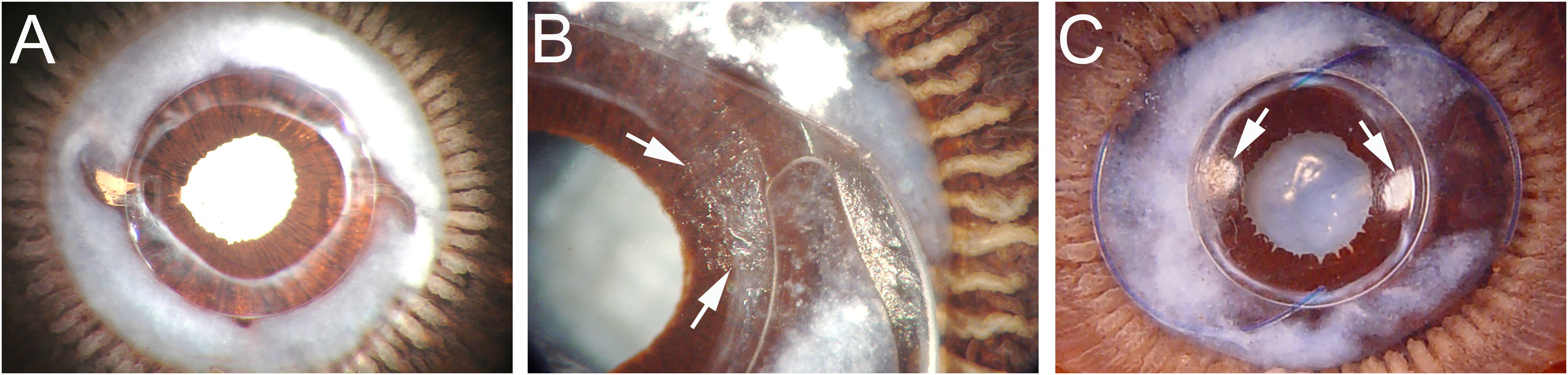 Three-panel gross Miyake-Apple images of a eyes from human cadavers subjected to cataract surgery approximately 2 years prior to death. Panel A shows a clear posterior capsule with a well formed Soemmering's ring.Panel B shows the haptic/optic junction of the IOL with arrows showing cells migrating onto the posterior capsule. Panel C shows a capsular bag implanted with a square edge IOL with Soemmering's ring and the arrows show the formation of peripheral PCO on opposite sides of the lens.