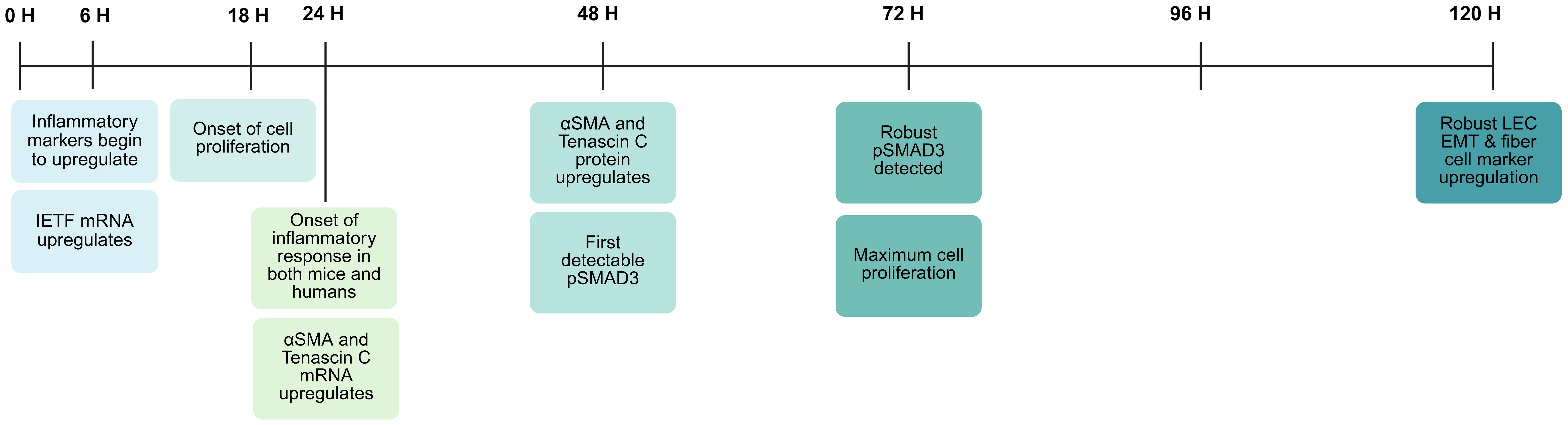 Figure 4. Injury response time course in lens epithelial cells PCS in an in vivo mouse model of cataract surgery (184). Figure created with Biorender.