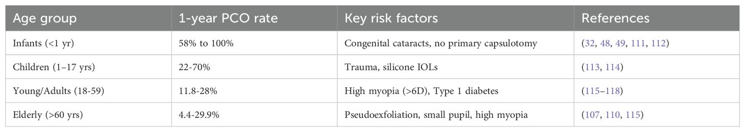 Certain patient populations demonstrate disproportionately high susceptibility to early-onset PCO. Pediatric patients exhibit the highest incidence, with reported rates ranging from 40% to 100% at one-year post-surgery (Table 1) (32, 48, 49, 111, 112). This elevated risk is driven, at least in part, by biological factors such as the heightened proliferative capacity of pediatric LECs, increased TGFβ and fibroblast growth factor (FGF) signaling, and more robust postoperative inflammatory responses (32, 117, 129, 130). However, a mismatch between the posterior curvature of the pediatric lens and the adult designed IOLs used “off label” in these patients likely also influences this enhanced PCO rate as this would compromise the seal between the IOL and posterior lens capsule consistent with the “no space, no cells” principle for PCO prevention (88). Young adults show intermediate risk, with PCO rates ranging from 11.8% to 28%, again likely due to a more robust wound healing response (Table 1) (115118).