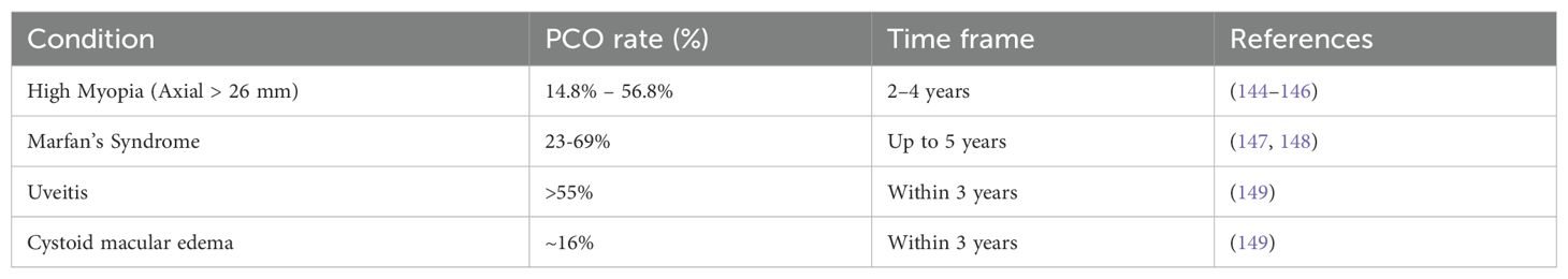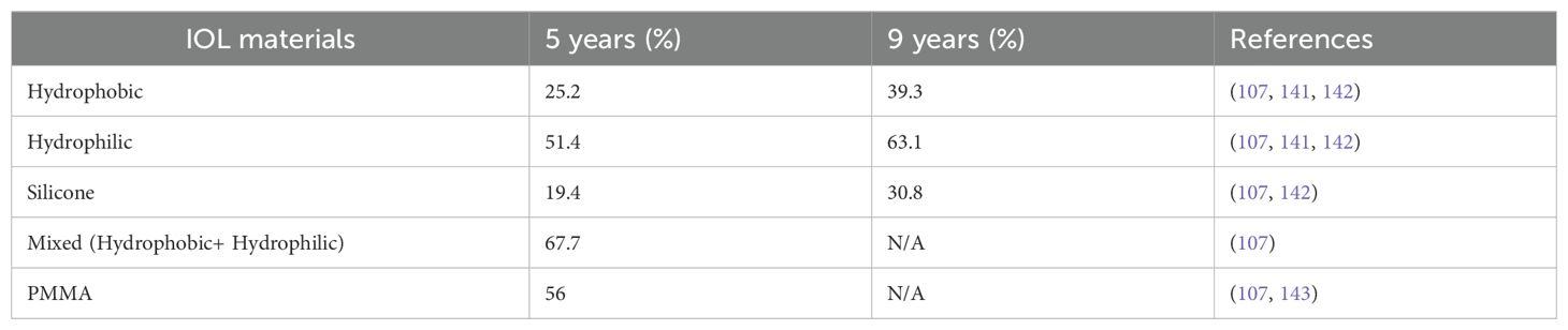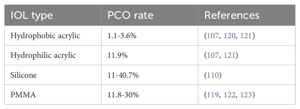 Early-onset PCO, also referred to as acute PCO, is defined as opacification that develops within the first year following cataract surgery. Its incidence has substantially reduced over the past decade, largely due to advancements in surgical techniques, IOL design, and postoperative care (39, 42, 49, 110). Large population-based studies now report clinically significant early-onset PCO in approximately 2–4.5% of adult patients within the first postoperative year, a marked improvement compared to historical rates of 10–20% prior to 2000 (Table 1) (107, 119). The most pronounced reductions have been observed in patients receiving hydrophobic acrylic IOLs with 360° square-edged optics (Table 2), particularly when combined with complete cortical cleanup and an optimized capsulorhexis–optic overlap (30, 110, 124, 125). Prospective studies utilizing these methods have reported 1-year PCO rates as low as 1.1% (Table 2) (120). In contrast, higher rates of early-onset PCO persist in patients implanted with silicone IOLs, with incidences ranging from 11% to 40.7% reported as early as 6 weeks to 3 months postoperatively (Table 2) (107, 110, 126, 127), although advances in silicone IOL manufacturing have now led to the release of square-edged silicone IOLs with lower rates (90, 128).
