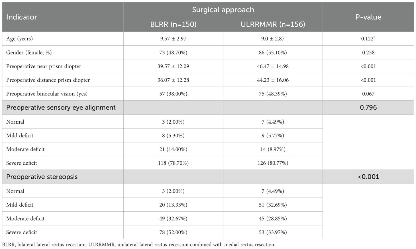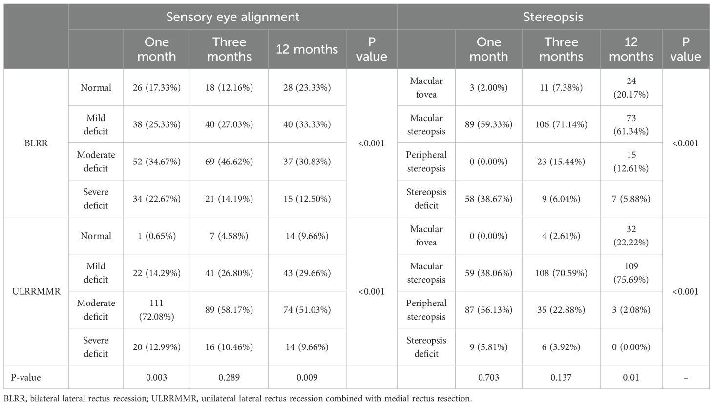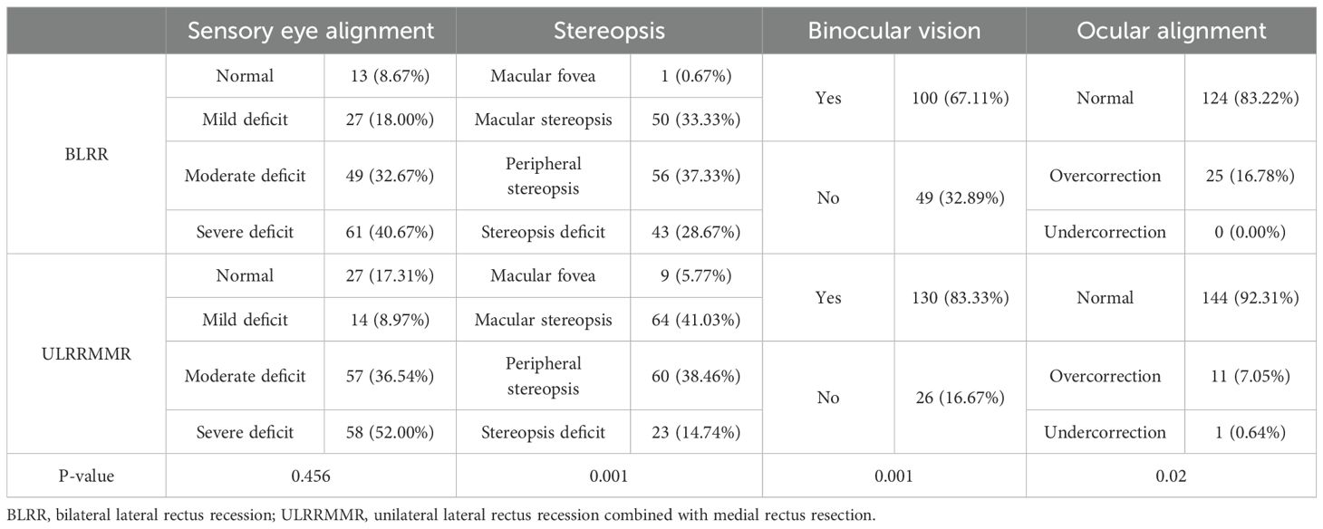 Previous studies have investigated the outcomes of these surgical techniques, with mixed results regarding the degree of improvement in stereopsis and binocular vision (5–8). For instance, BLRR has been traditionally favored for its ability to achieve a stable and long-lasting correction, while ULRRMMR is thought to provide a more controlled adjustment for cases with specific alignment patterns. However, there is limited evidence directly comparing the postoperative recovery profiles of these two approaches, especially with regard to long-term outcomes in sensory eye alignment and stereopsis.