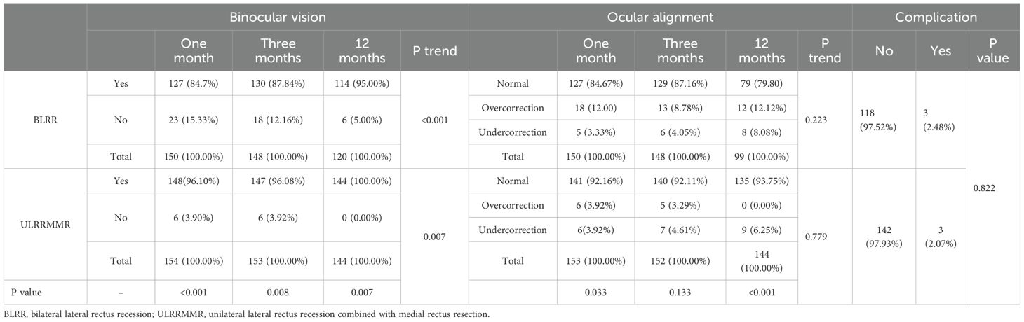 The postoperative outcomes for both BLRR group and the ULRRMMR group showed significant improvement over long time (Table 3). In the BLRR group, the percentage of patients with sensory eye alignment increased from 17.33% at 1 month to 23.33% at 12 months, with a highly significant trend (P < 0.001). The group also exhibited substantial progress in stereopsis function, with the foveal stereopsis improving from 2.00% at 1 month to 20.17% at 12 months (P < 0.001). Binocular vision recovery was notably high, with 84.7% of patients achieving binocular vision at 1 month, increasing to 95.00% at 12 months (P < 0.001). At 12 months, the motor success rate (defined as residual deviation ≤10 PD at distance) was 87.50% in the BLRR group. However, the normal eye alignment rate showed no significant changes during 1 to 12 months after surgery (P = 0.223). Complication rates were minimal in this group, with 97.52% of patients showing no complications at 1 month, suggesting favorable safety and recovery outcomes. Similarly, the ULRRMMR group demonstrated a higher overall rate of sensory eye alignment (92.16% at 1 month to 93.75% at 12 months), and a significant improvement in stereopsis function. At 12 months, 22.22% of patients showed foveal stereopsis, and 75.69% had improved stereopsis compared to 38.06% at 1 month (P < 0.001). The recovery of binocular vision was even more favorable in this group, with 96.08% of patients achieving binocular vision at 12 months. The motor success rate in the ULRRMMR group was 91.18% at 12 months, which was comparable to the BLRR group (P = 0.281). There was no significant difference in the normal eye alignment from 1 to 12 months (P = 0.779). The complication rates were low in the unilateral recession group, with minimal undercorrection (6.25% at 12 months) and only a small increase in overcorrection (3.92% at 1 month to 5.88% at 12 months).