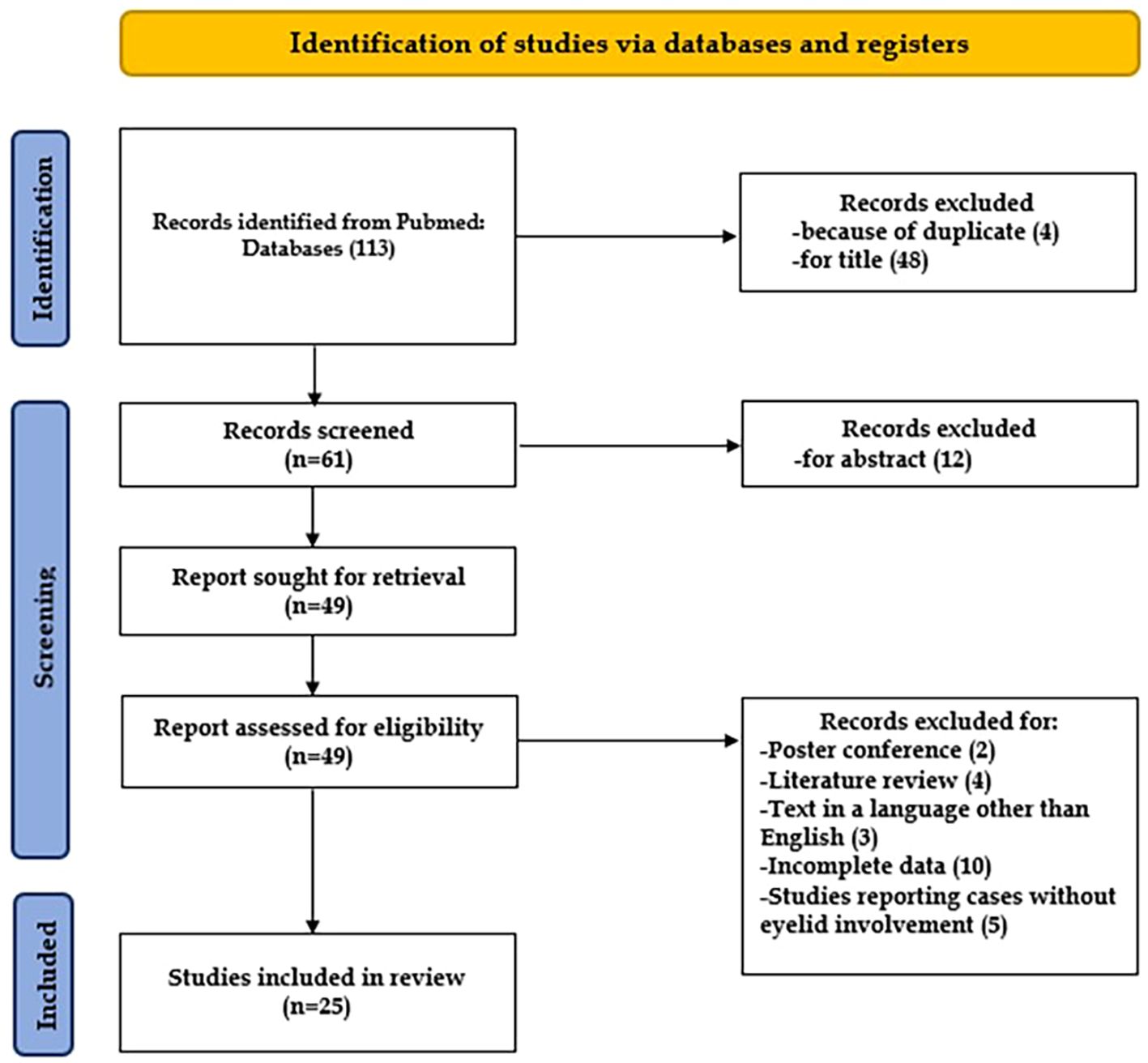 After screening a total of 113 articles, 25 met the predefined inclusion criteria and were included in the final review, as illustrated in Figure 2. Overall, the review comprised 76 patients diagnosed with Merkel cell carcinoma (MCC) of the eyelid.