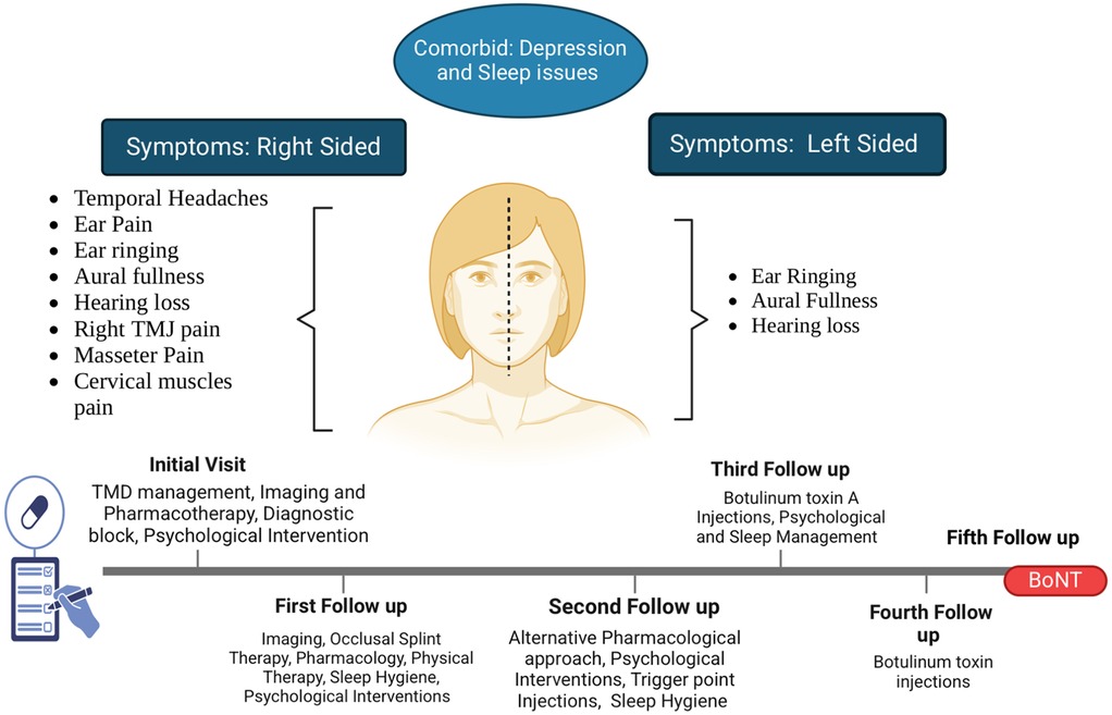 Painful TMD continues to be a diagnostic challenge due to complex relations between the signs and symptoms that are or are not related to the disorder. Often coexistence of non-specific symptoms (fullness, ringing in the ears, or tinnitus) with painful TMD can make diagnosis difficult. Additionally, long-lasting undiagnosed pain conditions can increase the prevalence of associated sleep disturbances and psychological comorbidities such as depression, anxiety, pain catastrophizing, or rumination and vice versa (28). In this case, the patient reported greater scores on the questionnaire used to assess the psychosocial and sleep status. These are the key variables that amplify the pain perception and maintain the chronicity of the condition. In addition to physical pain management, the authors’ goal of treatment is to resolve the associated conditions of sleep and psychological comorbidities. Hence, as a clinician, identifying how pain affects sleep or depression and vice versa is likely to yield improved outcomes for patients experiencing chronic pain. Taken together, these clinical findings in the present case strongly imply that all these conditions, pain, depression, and sleep disturbances, are fundamentally interconnected and highlight the need for a multidisciplinary approach, including sleep hygiene, cognitive behavioral therapy, and biofeedback sessions in managing the pain.