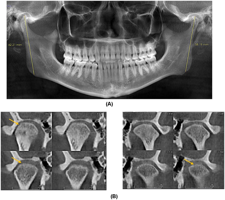 Figure 2. (A) Panoramic Image demonstrating increased right ramus height compared to left. (B) Coronal Sections of right and left condyle showing mild cortical erosion.