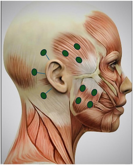 Figure 3. Botulinum toxin injection sites for masseter, temporalis muscles, and three other sites 1 cm from the superior aspect of the auricle, 1 cm behind the auricle, and 1 cm behind the inferior aspect of the auricle (5 U each site bilaterally). Adapted with permission from “Female Head Muscles Anatomy - Side view stock photo” by decade3d, licensed under Standard License.