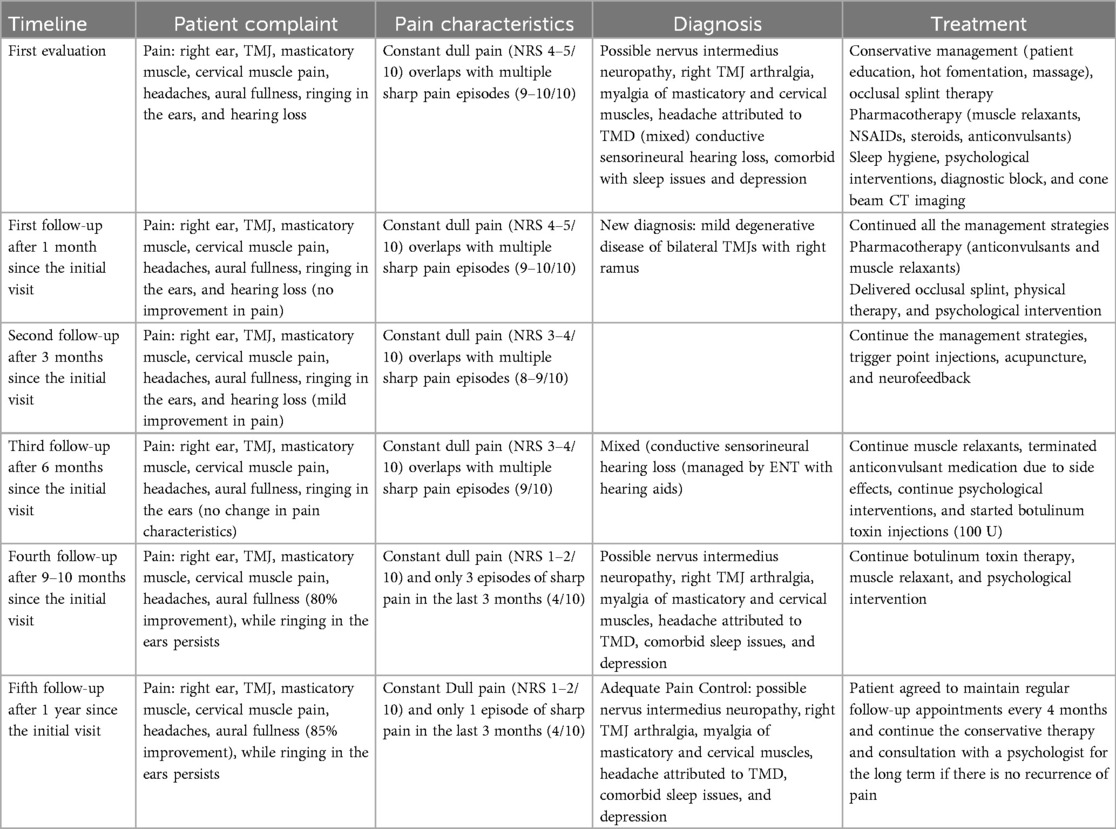 The most common effective treatments reported in the literature for nervus intermedius neuropathy were pharmacological management, such as anticonvulsants (carbamazepine, oxcarbazepine, gabapentin, pregabalin), serotonin or epinephrine reuptake inhibitors (duloxetine, venlafaxine), tricyclic antidepressants (amitriptyline), tramadol, opioids, NSAIDs, and surgical procedures. Interestingly, the patient has shown complete remission of symptomatology at her longest follow-up with a combination of surgery and medications (29, 30). The patient received anticonvulsant oxcarbazepine, gabapentin, and baclofen for the recommended period and on higher dosage; however, medications were withdrawn due to side effects and patient non-compliance. For management of painful TMD, prevailing treatment modalities were implemented, including self-care, oral appliances, physical therapy, ergonomic modification, muscle relaxants, mindfulness, sleep hygiene, stress management, and relaxation techniques (28).