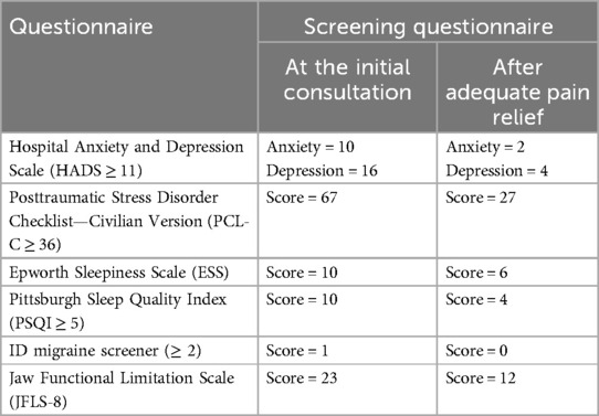 Additionally, several screening questionnaires were used before and after adequate pain control: Hospital Anxiety and Depression Scale to quantify anxiety and depression (HADS ≥ 11 for anxiety and depression), Posttraumatic Stress Disorder (PTSD) Checklist—Civilian Version (PCL-C ≥ 36), Pittsburgh Sleep Quality Index (PSQI ≥ 5), Epworth Sleepiness Scale (ESS), ID migraine screener (≥2), and Jaw Functional Limitation Scale (JFLS-8).
