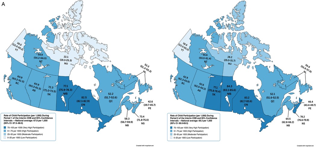 Table 2 reports the number of children receiving the Interim CDB and the rate of child participation by province and territory during P1, P2, AP1, and AP2. Provinces with the highest rates of child participation included Ontario, Manitoba, Nova Scotia, and Saskatchewan (Figure 1A). Interestingly, three of these provinces demonstrated an increase in rates from P1 to P2: Manitoba (77.1/1,000, 95% CI: 75.9–78.3 in P1 and 84.3/1000 95% CI: 83.1–85.6 in P2), Nova Scotia (73.4/1,000, 95% CI: 71.8–75.0 in P1 and 78.2/1000 95% CI: 76.6–79.9 in P2), and Saskatchewan (72.3/1,000, 95% CI: 71.0–73.5 in P1 and 77.1/1000 95% CI: 75.8–78.4 in P2) (Table 2 and Figure 1A).