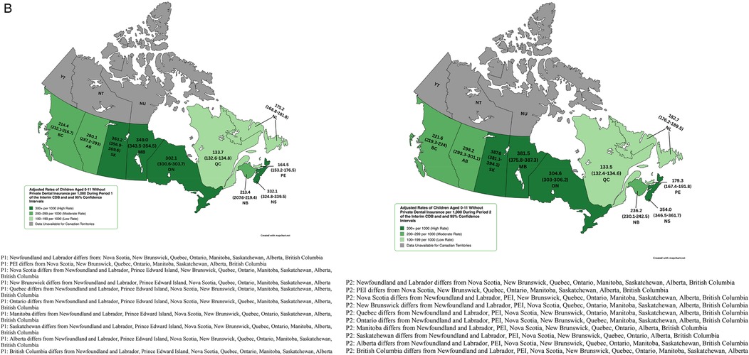 Adjusted rates of child participation limited to those without private dental insurance (obtained from the Canadian Oral Health Survey) revealed that Saskatchewan (363.2/1,000, 95% CI: 356.9–369.6) had the highest uptake in P1, followed by Manitoba (349.0/1,000, 95% CI: 343.5–354.5), Nova Scotia (332.1/1,000, 95% CI: 324.8–339.5), and Ontario (302.1/1,000, 95% CI: 300.6–303.7) (Figure 1B). Adjusted rates in P2 were higher; Saskatchewan (387.6/1,000, 95% CI: 381.1–394.1), Manitoba (381.5/1,000, 95% CI: 375.8–387.3), Nova Scotia (354.0/1,000, 95% CI: 346.5–361.7), and Ontario (304.6/1,000, 95% CI: 303–306.2) (Figure 1B).