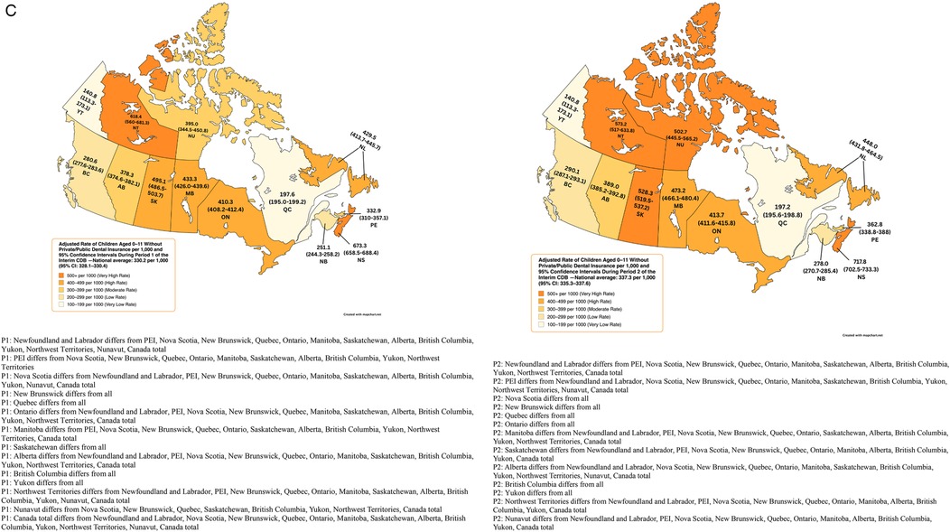 Adjusted rates and 95% CIs for those without private or public dental insurance appeared to differ between some provinces and territories (Figure 1C). For instance, Nova Scotia differed from Newfoundland and Labrador, PEI, New Brunswick, Quebec, Ontario, Manitoba, Saskatchewan, Alberta, British Columbia, Yukon, Nunavut, and the Canadian total in P1 and from all provinces and territories in P2. Adjusted rates for the Northwest Territories differed from Newfoundland and Labrador, PEI, New Brunswick, Quebec, Ontario, Manitoba, Saskatchewan, Alberta, British Columbia, Yukon, Nunavut, and the Canadian total in P1. In P2, adjusted rates for the Northwest Territories differed from Newfoundland and Labrador, PEI, Nova Scotia, New Brunswick, Quebec, Ontario, Manitoba, Alberta, British Columbia, Yukon, and the Canadian total. Meanwhile, Saskatchewan differed from all other provinces or territories in P1 and all except for the Northwest Territories and Nunavut in P2. In both periods, adjusted rates among those without private or public dental insurance differed from all other provinces and territories.