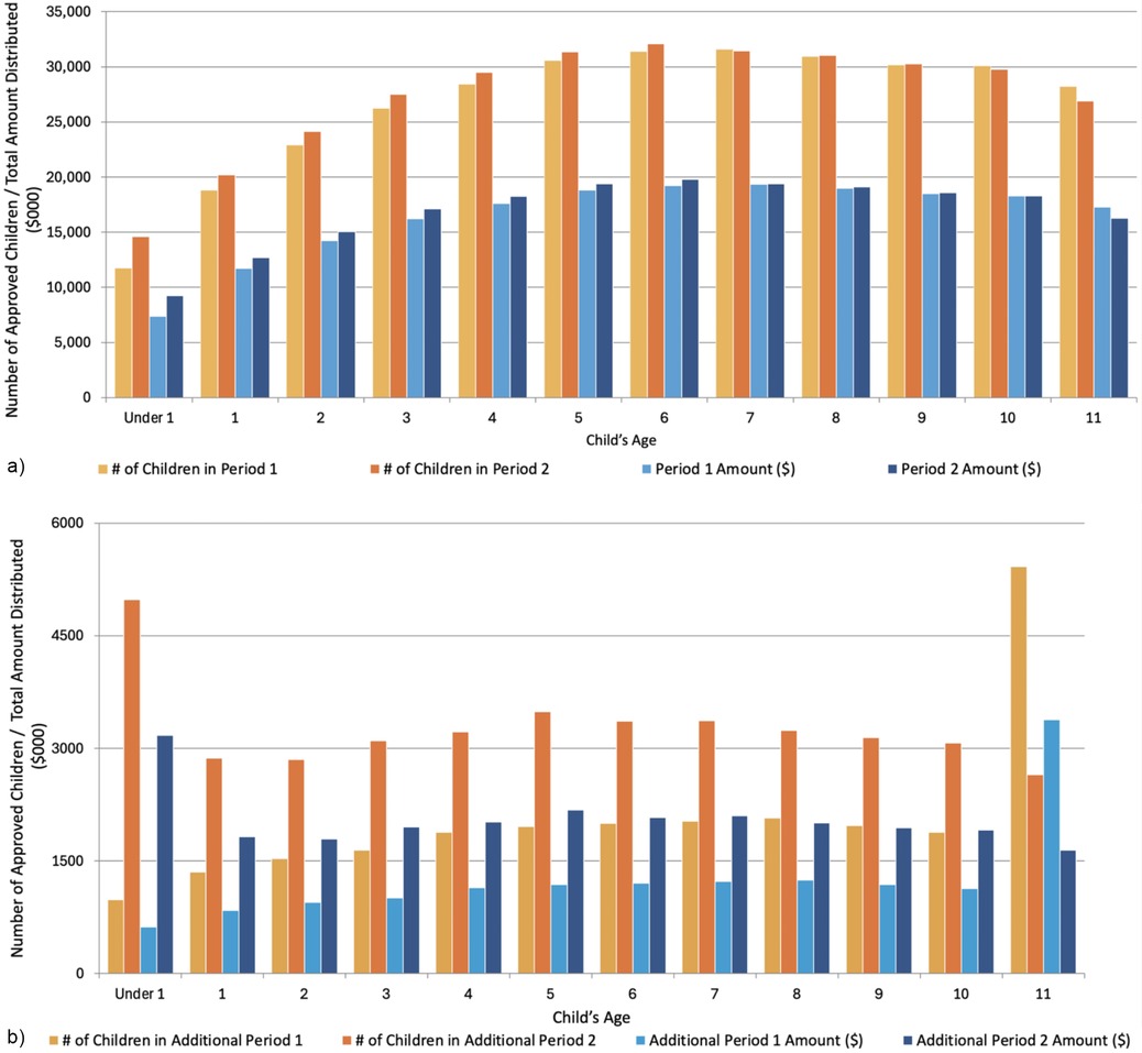 Figure 2. Total number of approved children and total amount distributed (in $000) during period 1, period 2, additional period 1, and additional period 2 of the interim CDB. (a) Number of approved children and total amount distributed ($000) by age during Period 1 and Period 2 of the interim CDB. (b) Number of approved children and total amount distributed ($000) by age during Period 1 and Period 2 of the interim CDB.