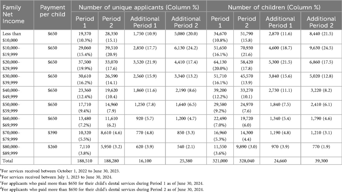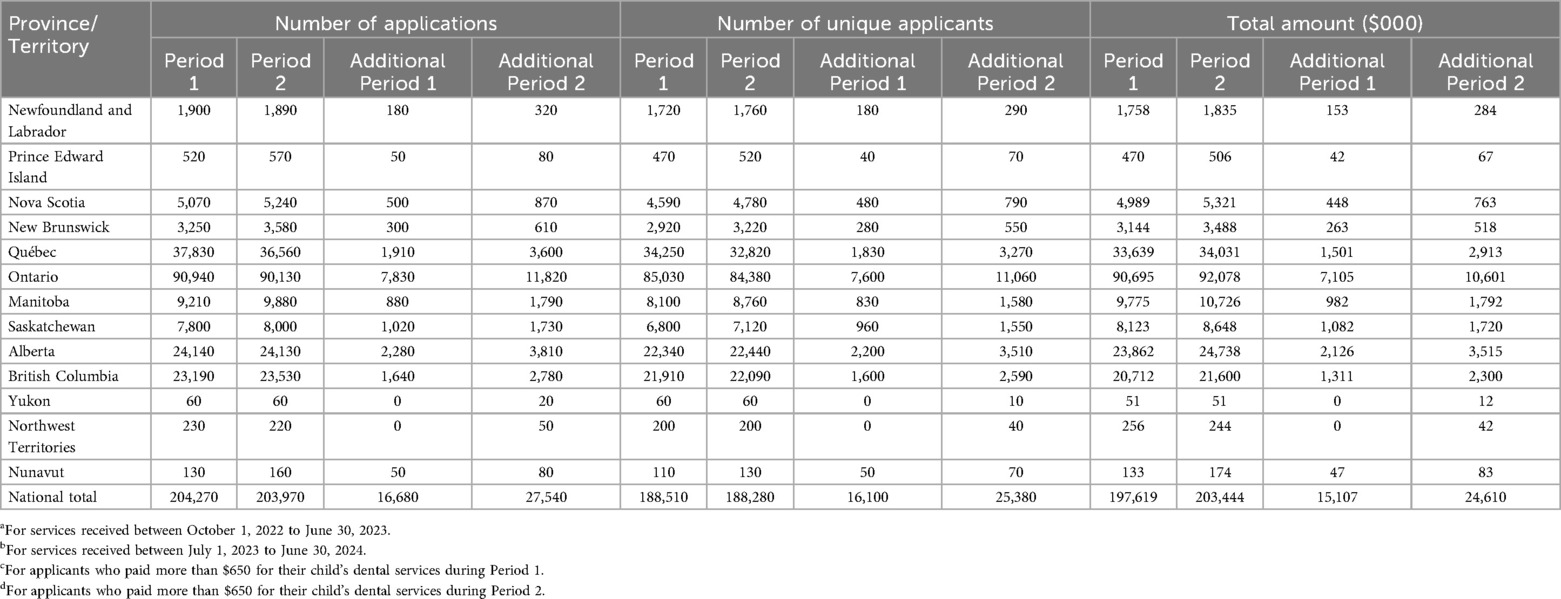 Data for this study were accessed from the CRA for applicants as of June 30, 2024, and assessed as of July 26, 2024. Data covered the entire first period (October 1, 2022–June 30, 2023) and 12 months of the second period (July 1, 2023–June 30, 2024). Data were segmented into four periods: Period 1 (P1), Period 2 (P2), Additional Period 1 (AP1), and Additional Period 2 (AP2). P1 includes applicants who applied, received the Interim CDB and sought dental care for their child(ren) between October 1, 2022, and June 30, 2023 (16). The P2 data include applicants who had dental treatment, applied, received the benefit, and sought dental care for their child(ren) between July 1, 2023, and June 30, 2024. AP1 data include applicants whose children had dental treatment with costs that exceeded $650 between October 1, 2022 and June 30, 2023. These applicants were eligible to apply and receive an additional $650 within the second pay period but would not be eligible to apply for the P2 of the Interim CDB. AP2 data include applicants who had children whose cost for dental treatment exceeded $650 between July 1, 2023, and June 30, 2024. They qualified to apply and receive an additional $650 within the second period, granted they had not applied for and received the Interim CDB within P1.
