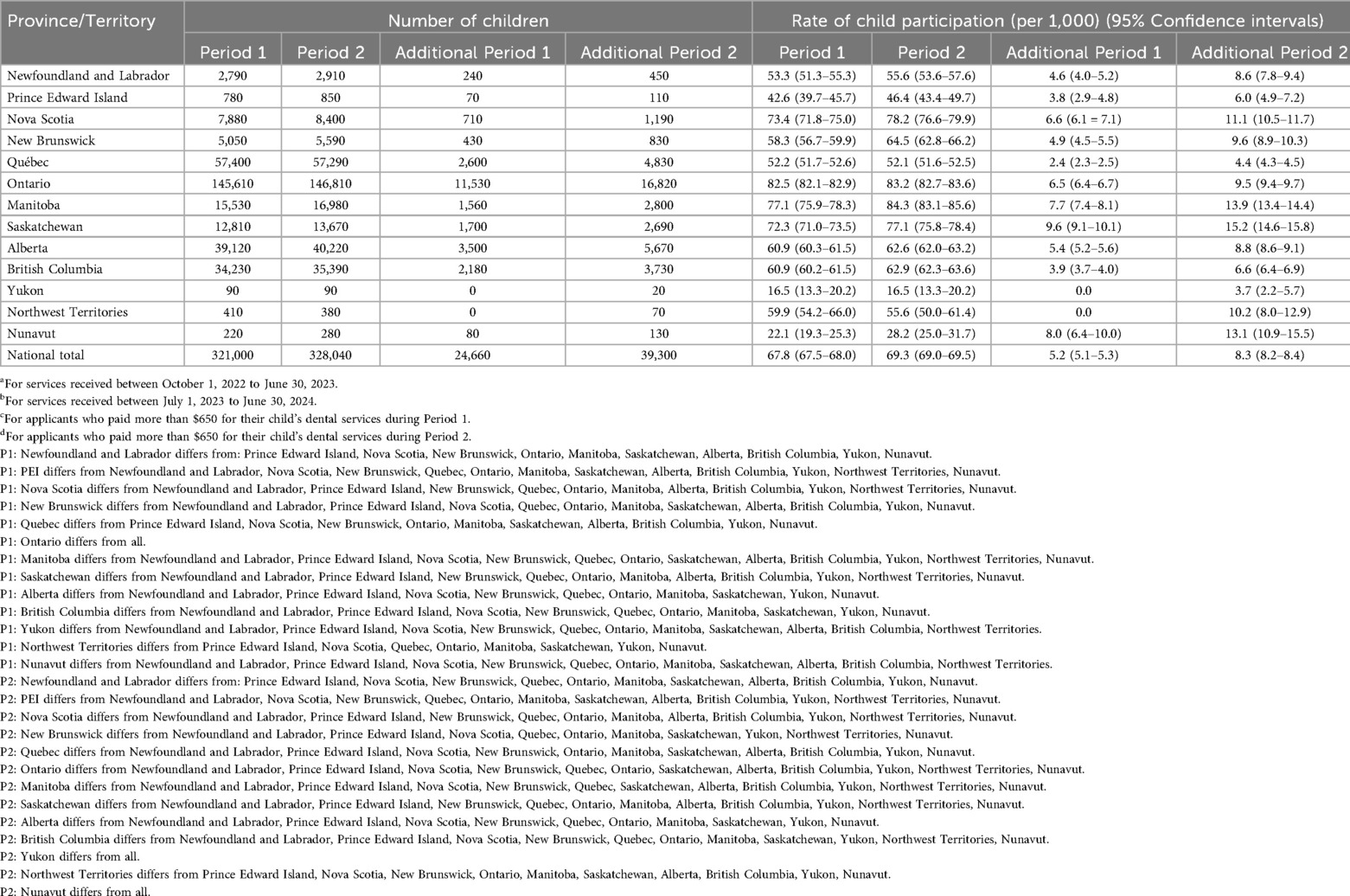 Methods: Data were accessed from the CRA for applicants and covered both the first (October 1, 2022–June 30, 2023) and second (July 1, 2023–June 30, 2024) periods. Rates of participation and 95% confidence intervals (CIs) were calculated using population data from Statistics Canada. Adjusted rates were calculated based on the proportion of children without private dental insurance, and without private or public insurance.